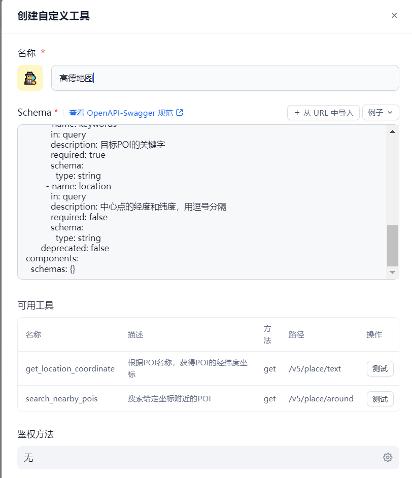 在工具添加页面,可以看到 Dify 已经内置了非常多工具了,这些我们可以直接用,也可以创建自定义工具。我们还是以上一节课中高德地图的两个工具为例,来看一下 Dify 的工具配置页面的设计思路。