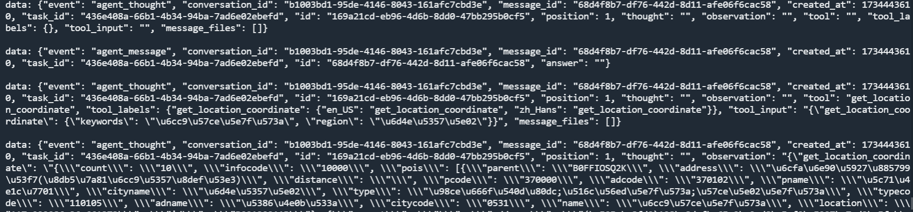在这里,<your_server_ip> 就是 Dfiy nginx 组件的访问 IP,端口默认是80,假如在最开始,你把 Nginx 的暴露端口改为了 10080,那么此时就需要写成 <your_server_ip>:10080 的形式。另外,参数response_mode 设置成了该对话采用的是流式模式。稍等片刻后会得到一段以流式形式返回的 HTTP Response。