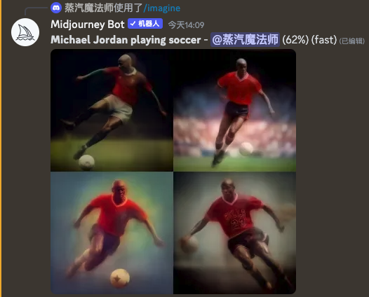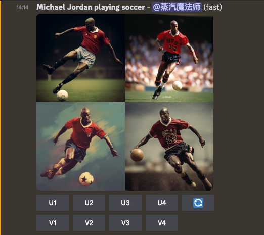 此外,针对每次你输入的提示语,Midjourney并不是为你直接生成一张高清晰度的大图,而是生成了4张不同的图片。这其实也是为了弥补Diffusion类型算法的一个缺陷,就是生成的图像可控性比较差,一次性就能拿到我们满意的图片的概率比较低。比如,我们这里输入的“Michael Jordan playing soccer”是想要生成迈克尔乔丹踢足球的照片。但是里面右下角的第四张图里,显然还是一个打篮球的姿势,只是把手上拿着的篮球换成了足球而已。而一次性提供四张图片,让用户可以从四张里面挑一张,显然成功率就高多了。