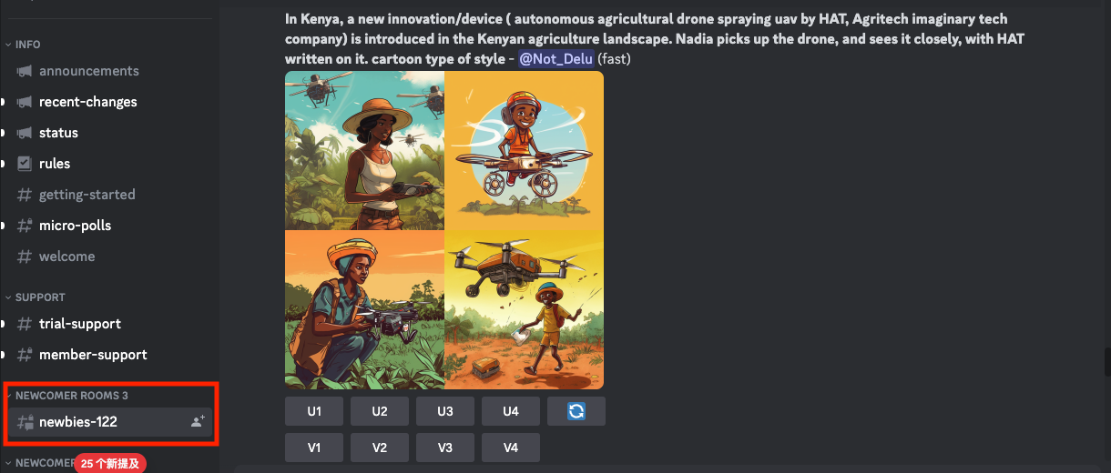 因为大部分人和你我一样,不太懂得绘画,也缺少一些想象力。这样,很容易随便画了两三张图片之后,就放弃使用Midjourney这样的产品了。所以,Midjourney就做了一个很巧妙的设计。就是你一旦注册成功,进入Midjourney的Discord频道之后,并不是让你对着Midjourney的机器人自己发挥想象去画画,而是会直接进入某一个新用户的聊天室里,无论是自己通过提示语去画画,还是其他在聊天室里的用户去画画,都会在聊天室里不停地刷新。