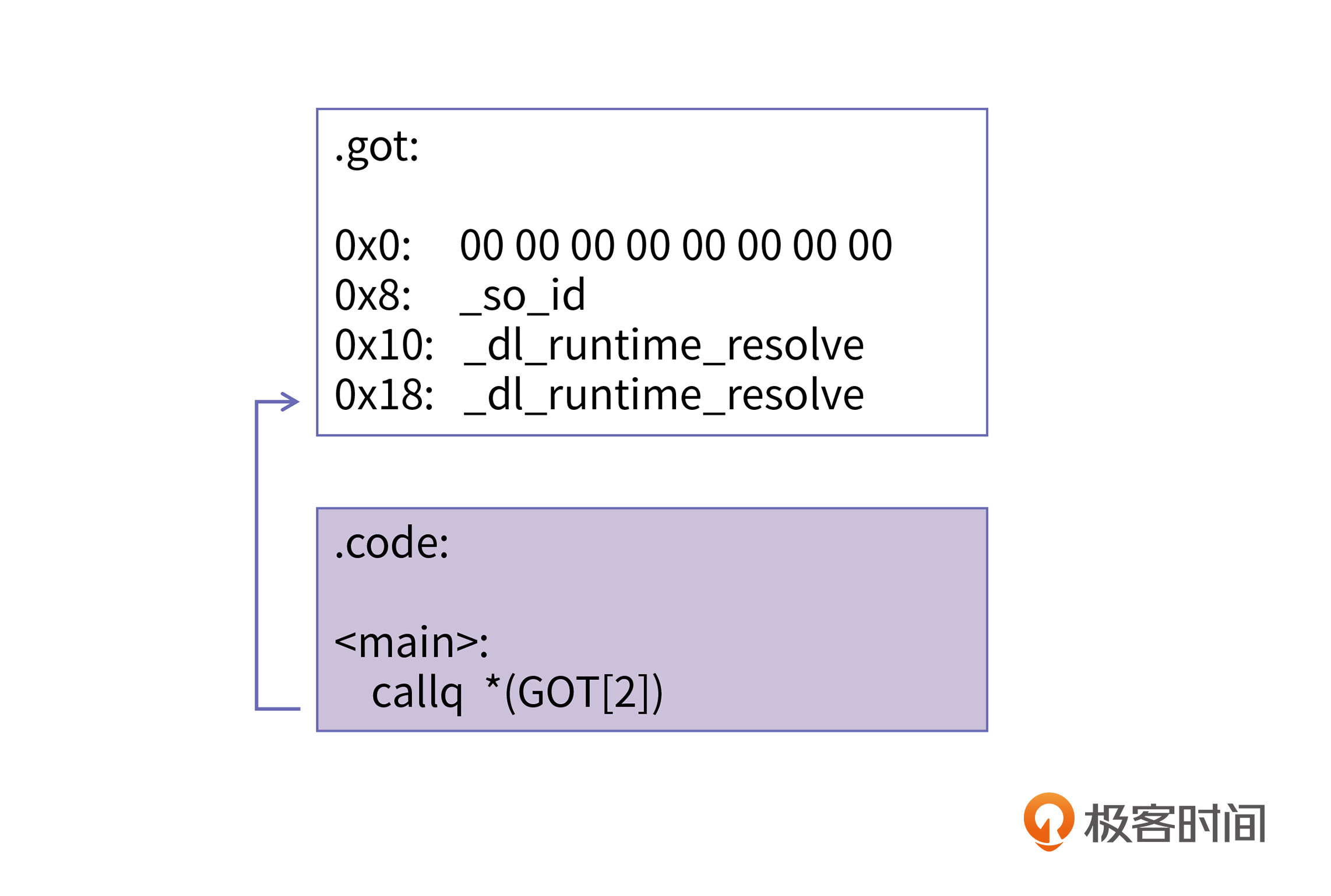这样的跳转虽然麻烦,但有一个非常重要的优点,就是运行期间不会修改代码段的指令,所有的修改只涉及了GOT这个位于数据段的表里。我们在[第3节课]就已经介绍过,.code和.plt会被加载到内存的代码段(code segment),它的权限是可读可执行,但不可写;上节课也讲了.got会被加载进数据段,它的权限是可读可写。我们现在介绍的多级跳转的延迟绑定技术的整个重定位过程最终只会修改GOT的0x18这一个位置,其他位置都不必发生变化。