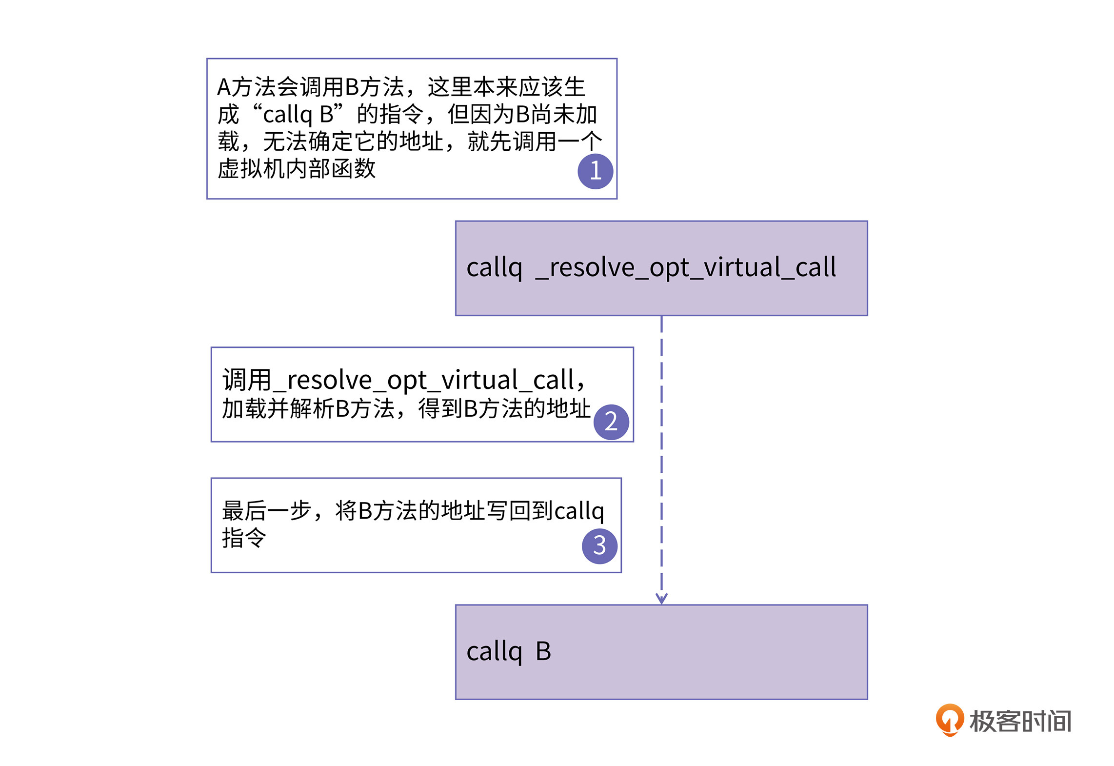 虚拟机会采用一种叫做patch code的技术,在运行时再进行加载。简单地说,就是在生成call指令时候,它的目标地址填成一个虚拟机内部的用于解析符号的方法。在CPU执行这条call语句的时候,就会调用符号解析函数。此时虚拟机就会加载B方法所在的类,然后就能确定B方法的地址了,这时再把B方法的地址写回到call指令里。这个过程如下图所示: