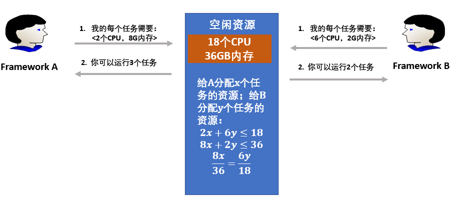 对于Framework A来说,每个任务要消耗总CPU资源的2/18,总内存资源的8/36,所以Framework A的主导资源为内存;对于Framework B来说,每个任务要消耗总CPU资源的6/18和总内存资源的2/36,因而Framework B的主导资源为CPU。