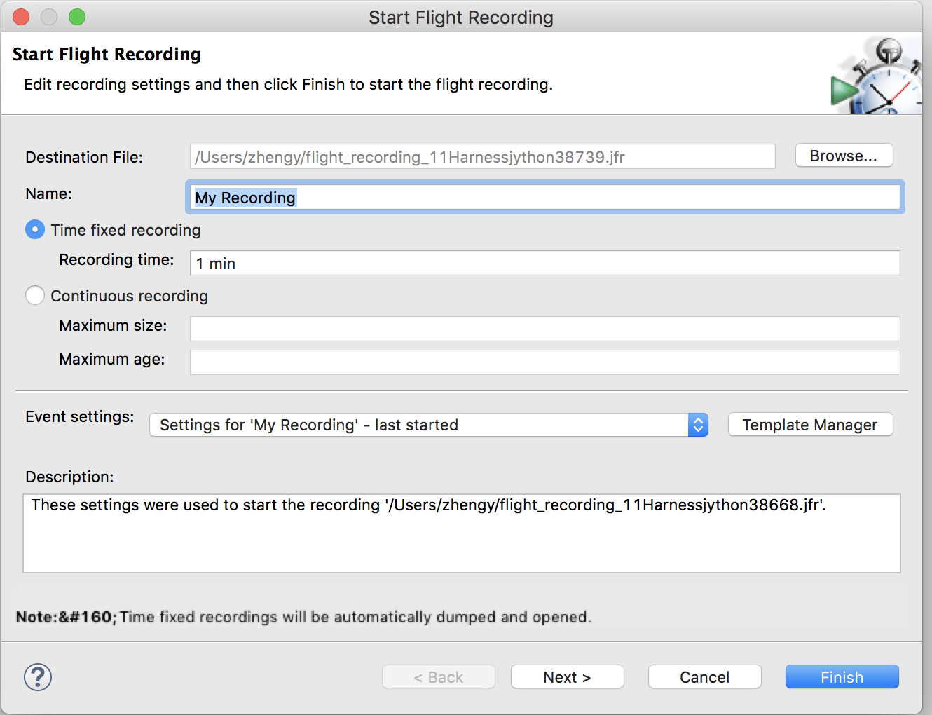 这里的配置参数与前两种启动JFR的方式并无二致,同样也包括标签名、收集数据的持续时间、缓存事件的时间及空间限制,以及配置所要监控事件的Event settings。
