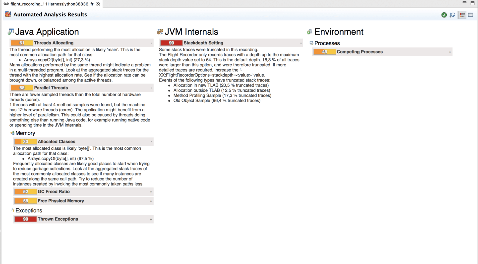 当收集完成时,JMC会自动打开所生成的jfr文件,并在主界面中列举目标进程在收集数据的这段时间内的潜在问题。例如,Parallel Threads一节,便汇报了没有完整利用CPU资源的问题。