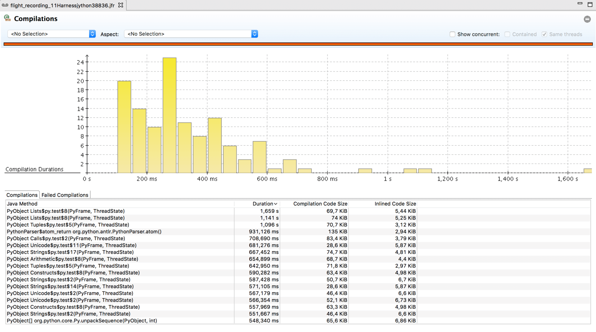 即时编译子系统所对应的选项卡则展示了方法编译时间的直方图,以及按编译时间排序的编译任务表。