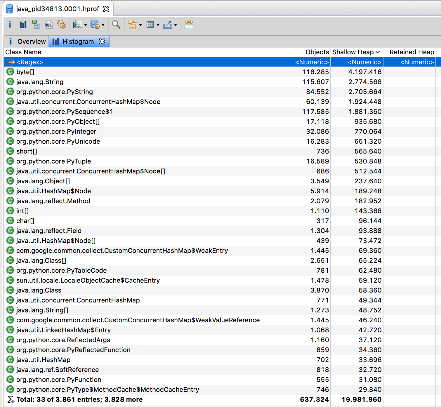 MAT的直方图和jmap的-histo子命令一样,都能够展示各个类的实例数目以及这些实例的Shallow heap总和。但是,MAT的直方图还能够计算Retained heap,并支持基于实例数目或Retained heap的排序方式(默认为Shallow heap)。此外,MAT还可以将直方图中的类按照超类、类加载器或者包名分组。