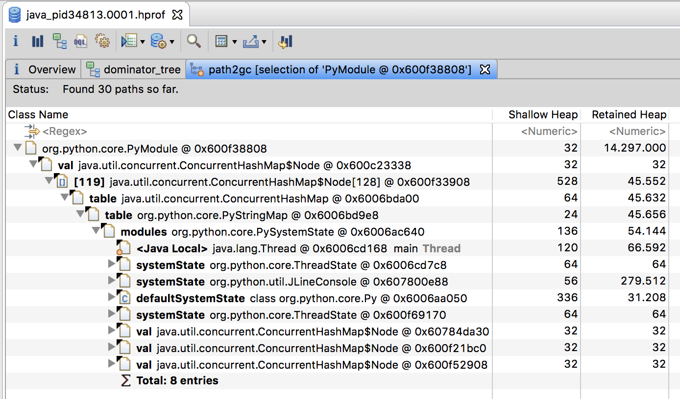 当在支配树视图中选中某一对象时,我们还可以通过Path To GC Roots功能,反向列出该对象到GC Roots的引用路径。如下图所示:
