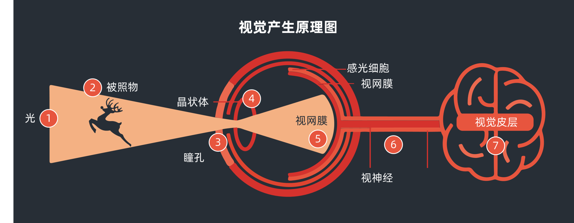 光作为一种电磁波,从光源开始在空间内传播。光要穿过媒介照到被照物,或反射、或折射,然后光波被视网膜底的感光细胞感觉到,最后再由感光细胞传到大脑形成视觉。在这个过程中少了任何一个环节都不行。