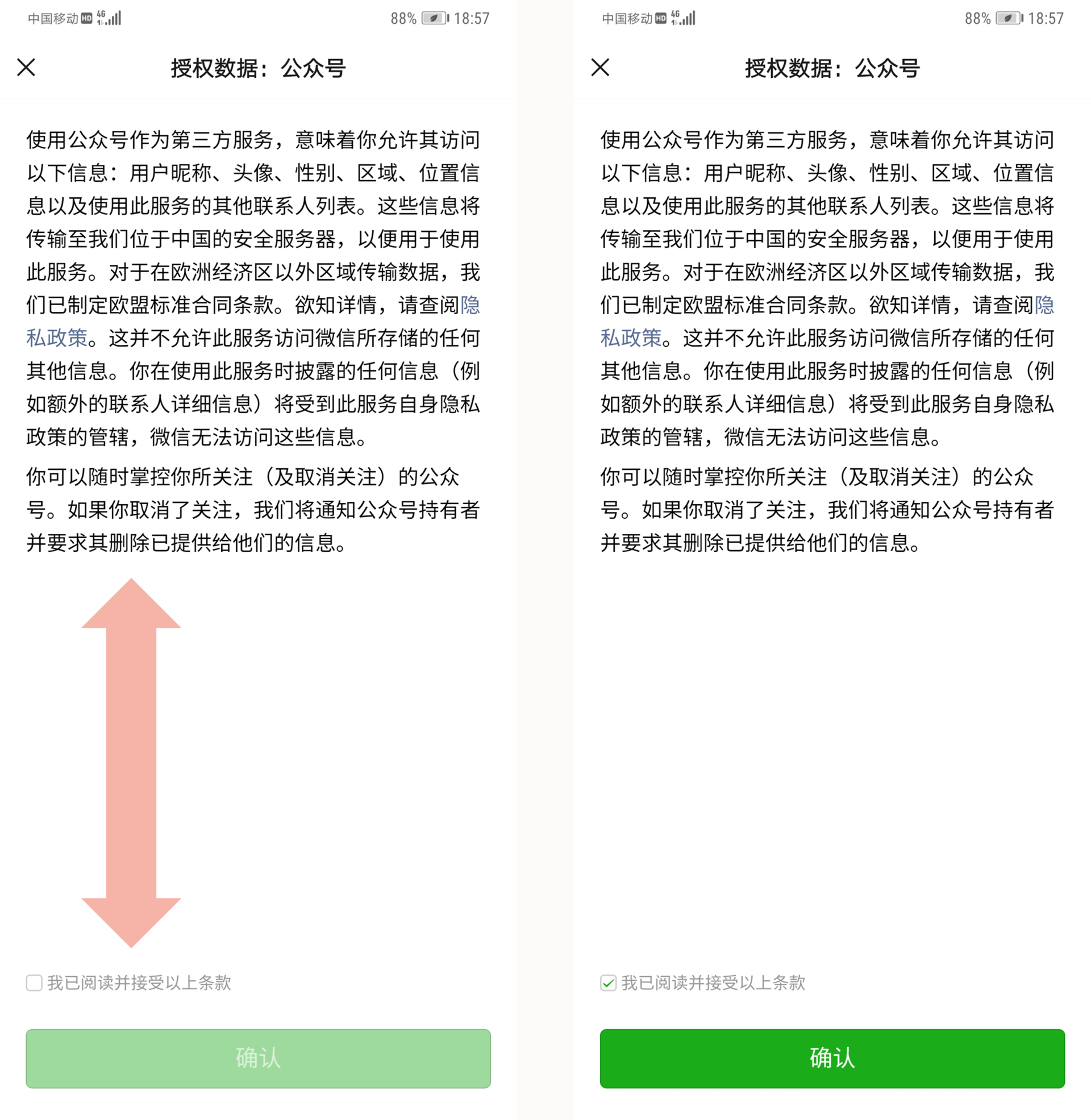 如果用户是第一次见到这个页面,那么在阅读完授权数据后,必须跳脱中央凹去寻找那个确认按钮。但由于绿色按钮不可点击,用户就得去搞明白为什么不可点击,经过一个迟疑的过程,然后去遍历整个屏幕,尝试找到突破口。