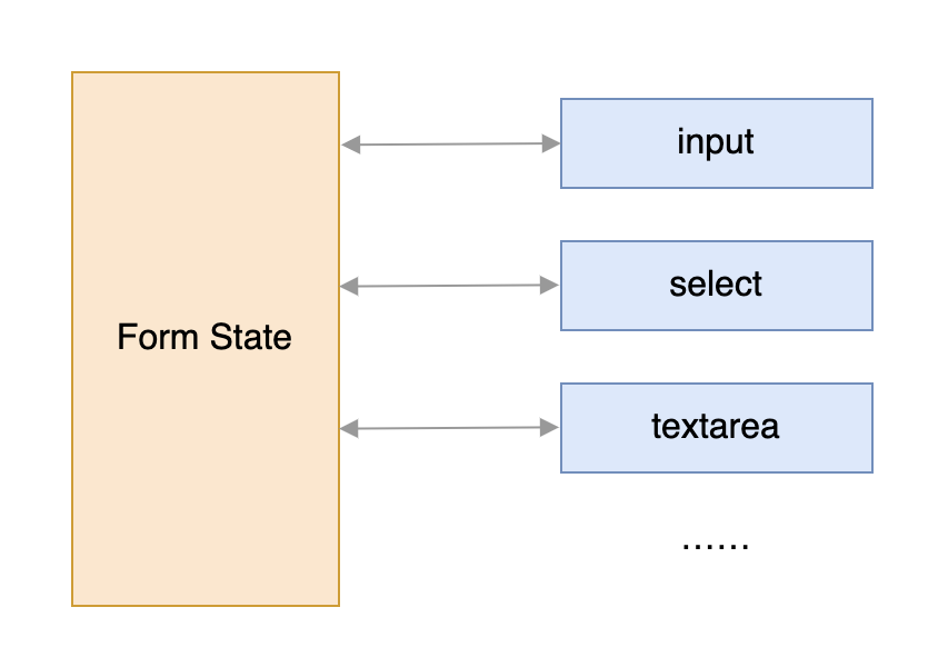 可以看到,一个表单的整体状态正是有一个个独立表单元素共同组成的。那么下图就展示了这样一个关系,对于每一个表单元素都需要手动的进行 value 和 onChange 属性的绑定: