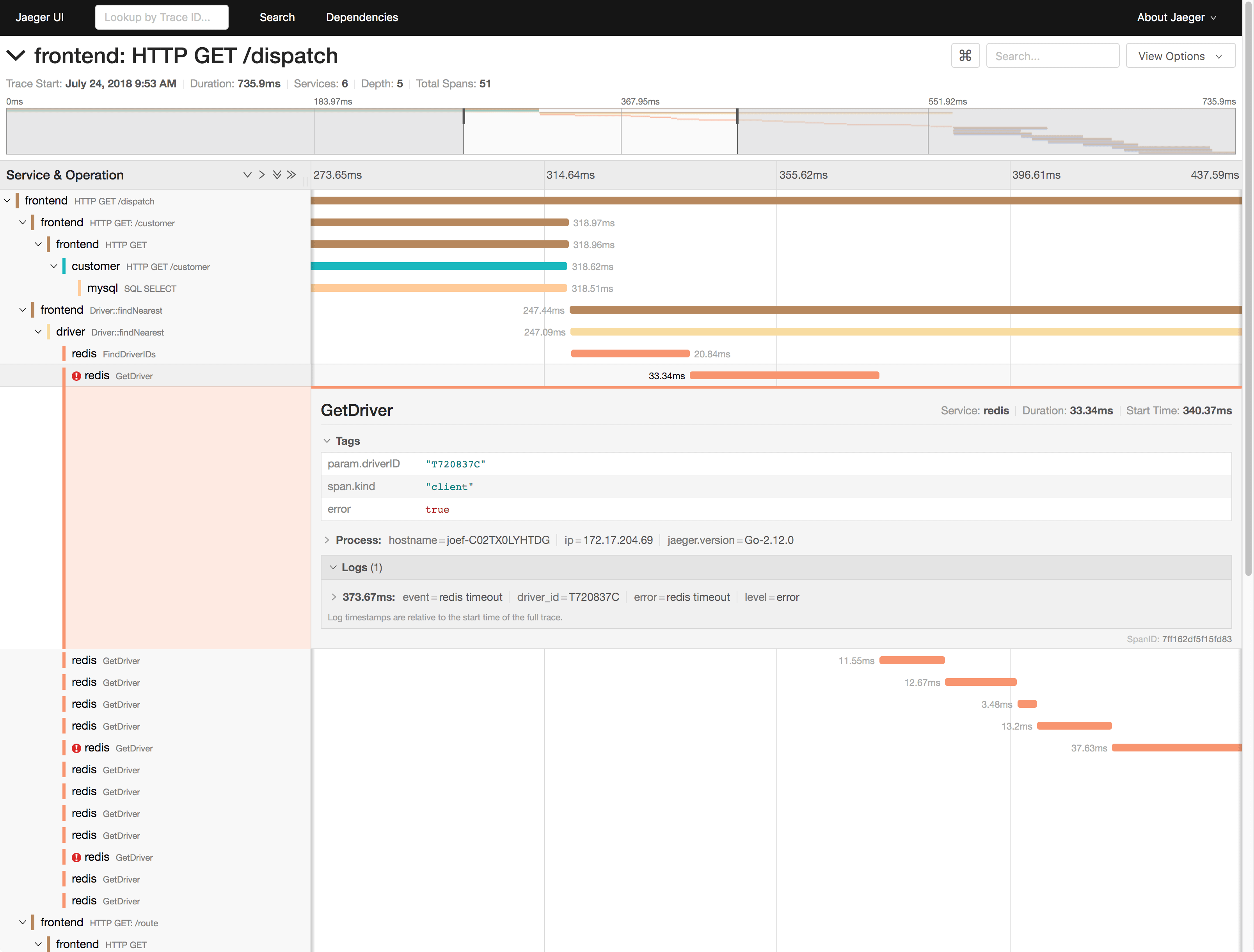 比如,下图就是一个 Jaeger 调用链跟踪的示例。