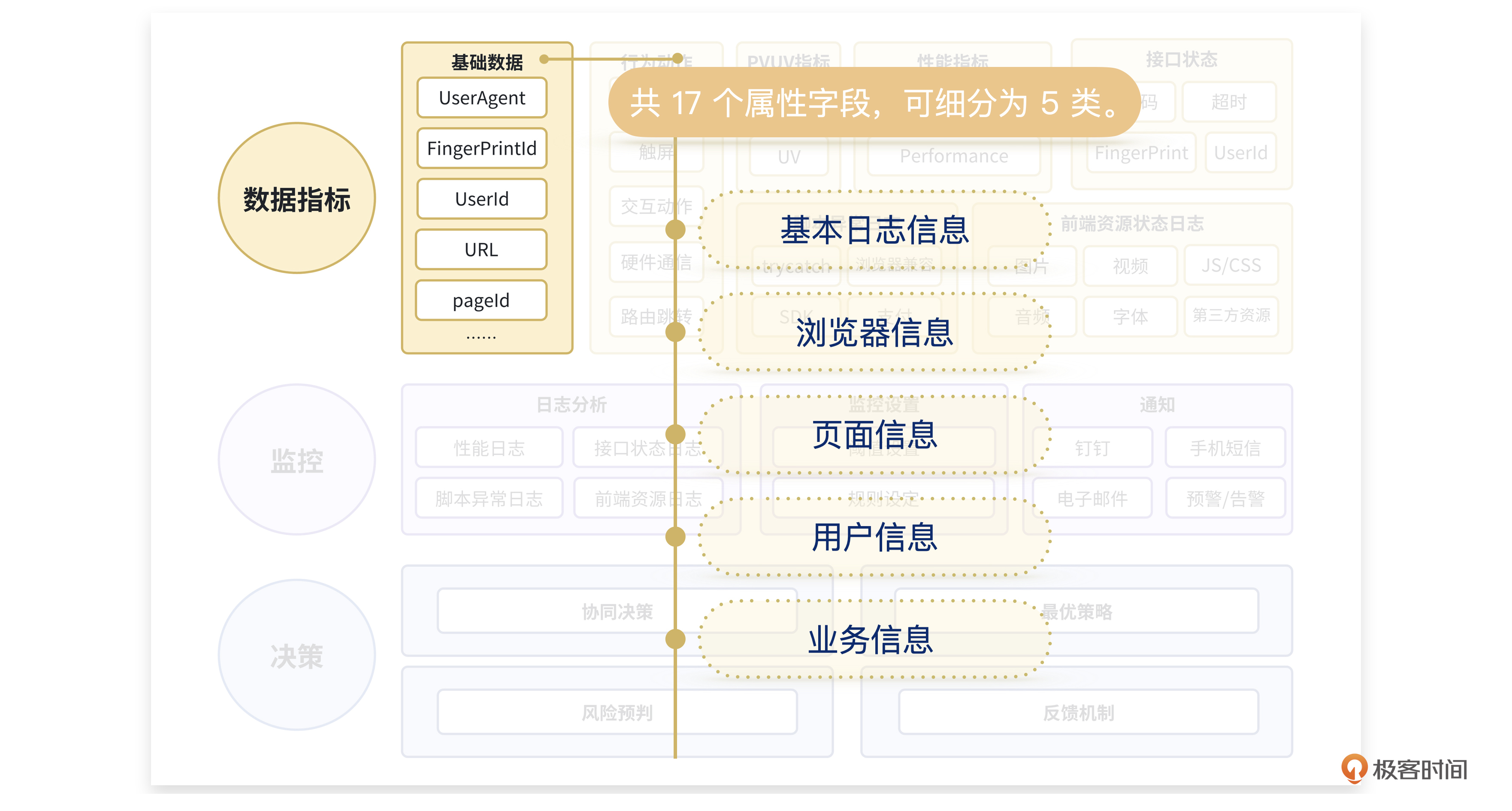 基础数据类型中一共有17个属性字段,又细分为5种类别:基本日志信息、浏览器信息、页面信息、用户信息、业务信息。