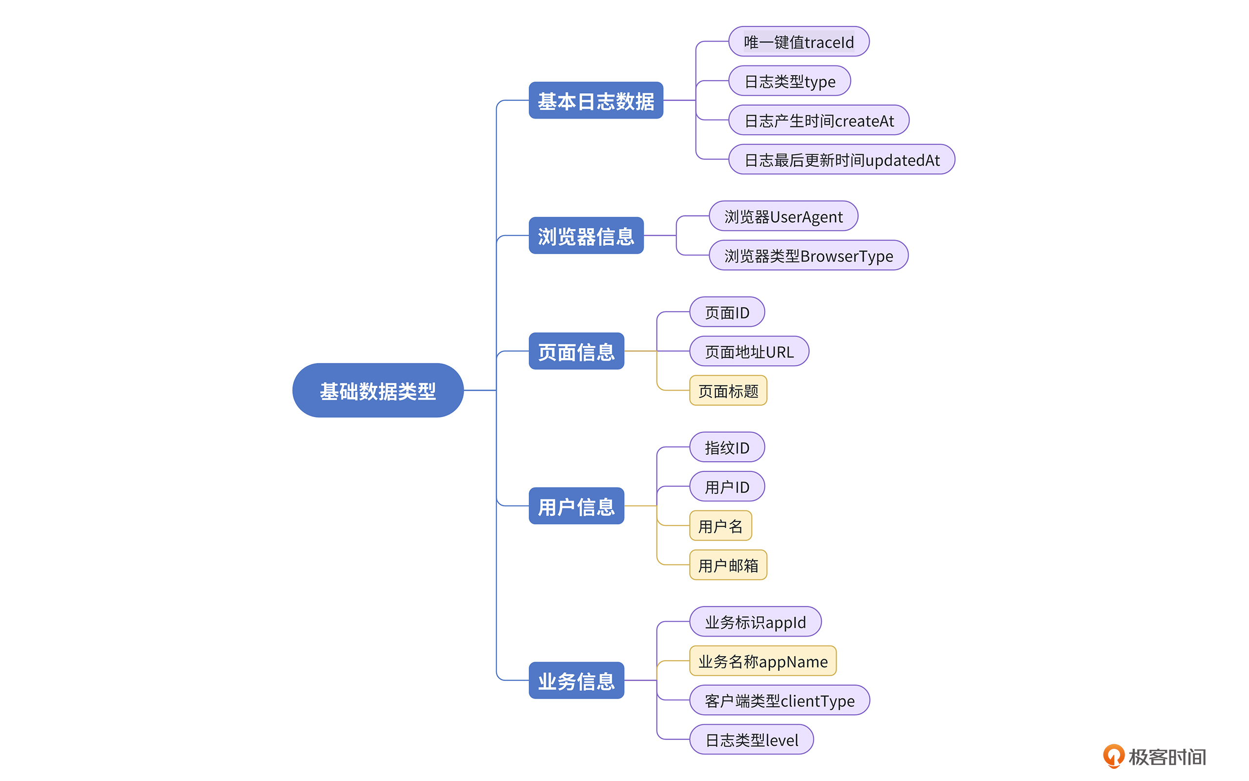 首先,我们先将众多的基础属性字段分成5大类别,基本日志信息、浏览器信息、页面信息、用户信息、业务信息。