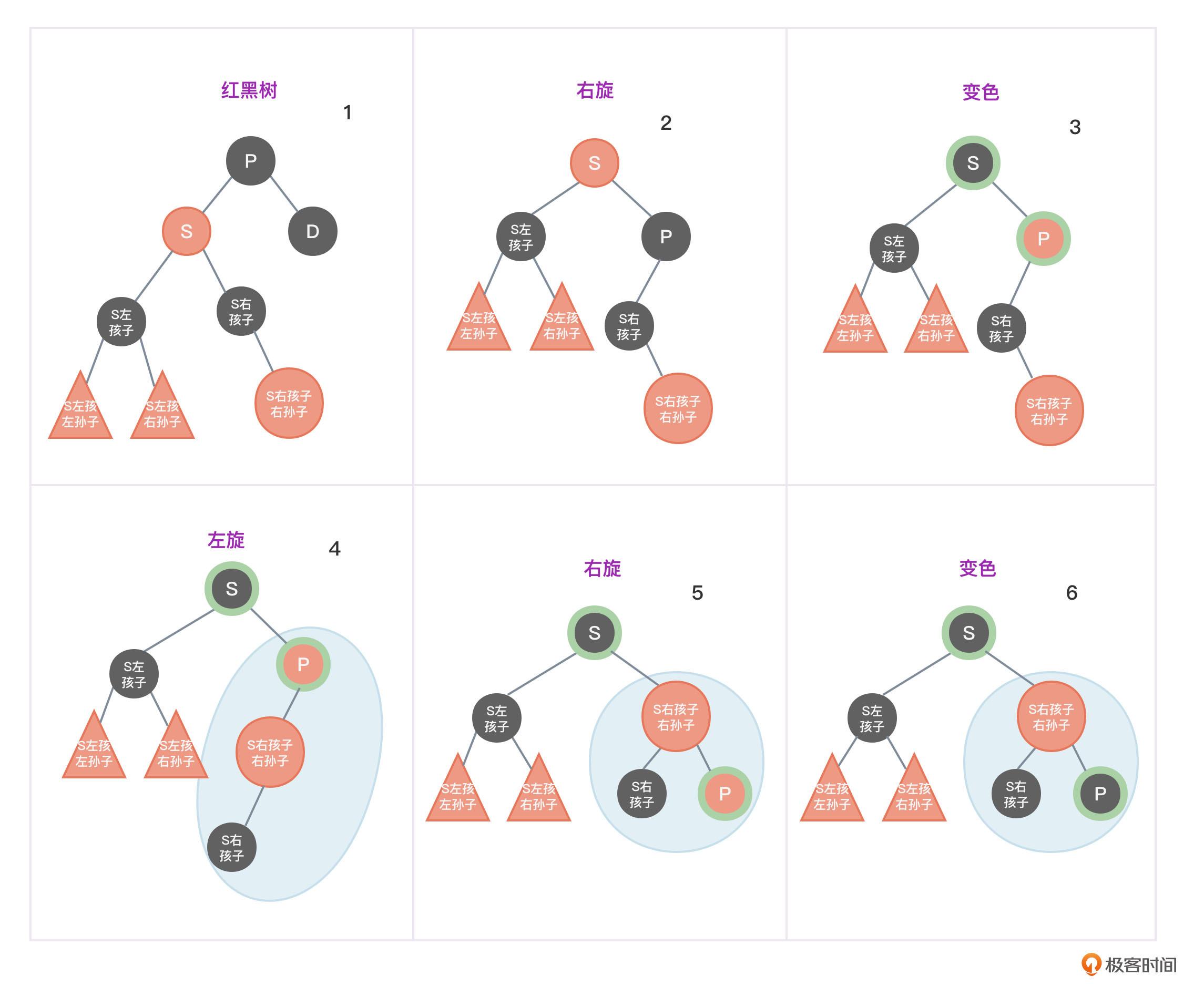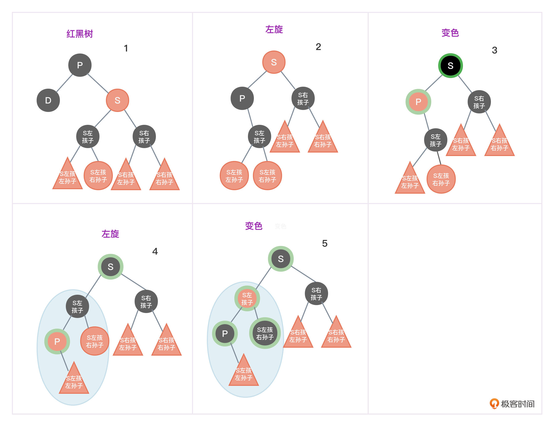 - 将S左孩子节点变为红色,将P和S左孩右孙子节点变为黑色,避免两个红色节点挨在一起。