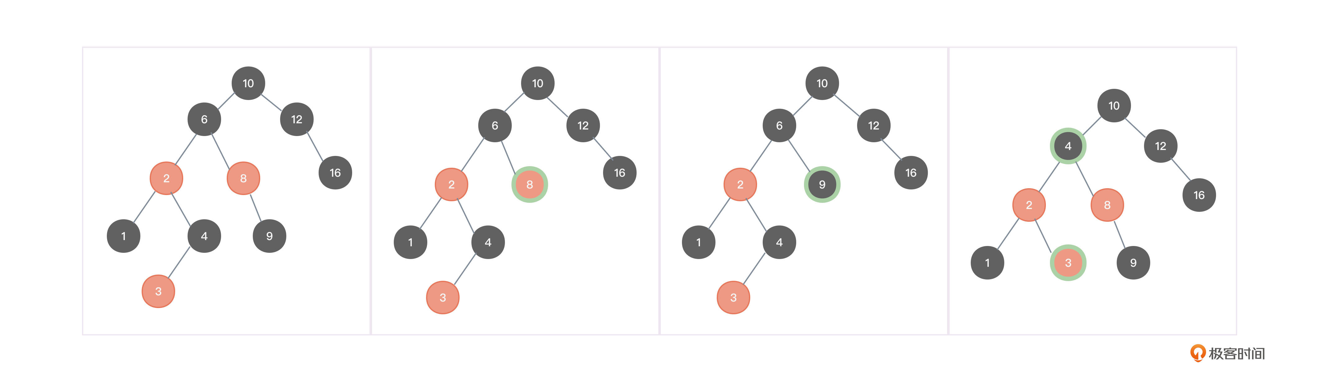 - 如果要删除节点6:节点6的左右子树都不为空,找到节点6左子树的最右下节点4,用右下节点的值4覆盖节点6中的值6(值6变成了值4),最后再把最右下这个节点4删除。当然还要注意到节点4还带了一个左节点3,因此节点4的父节点2要指向节点3。当然,节点3的父指针也要指向节点2。删除节点后得到的结果如图1中的第4张图所示。