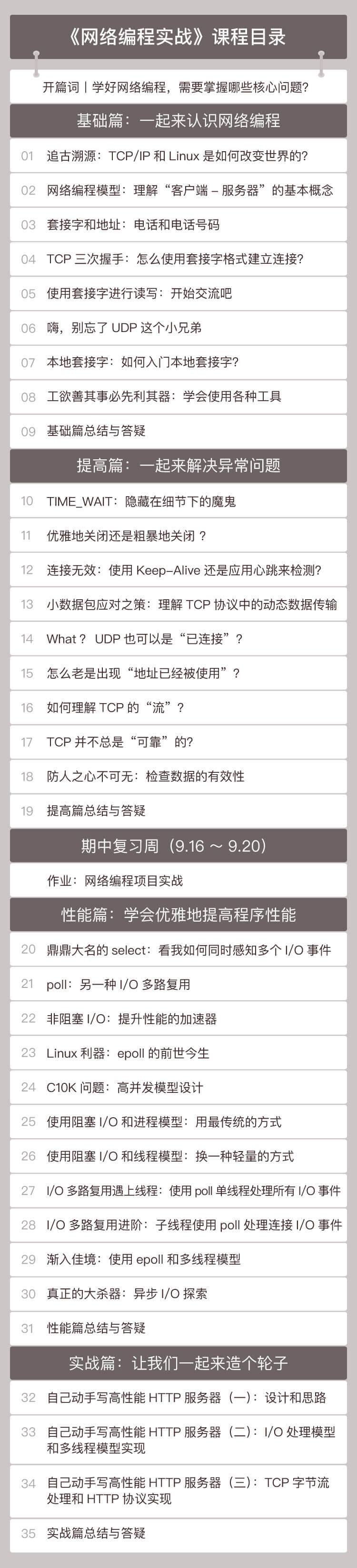 第三个层次,写出可以支持大规模高并发的网络处理程序。在这个阶段,我将带你一起深入研究C10K问题,引入进程、线程、多路复用、非阻塞、异步、事件驱动等现代高性能网络编程所需要的技术。我们将在性能篇深入讨论这些技术,并在实战篇结合实例,一步步教你写出高性能的网络程序。