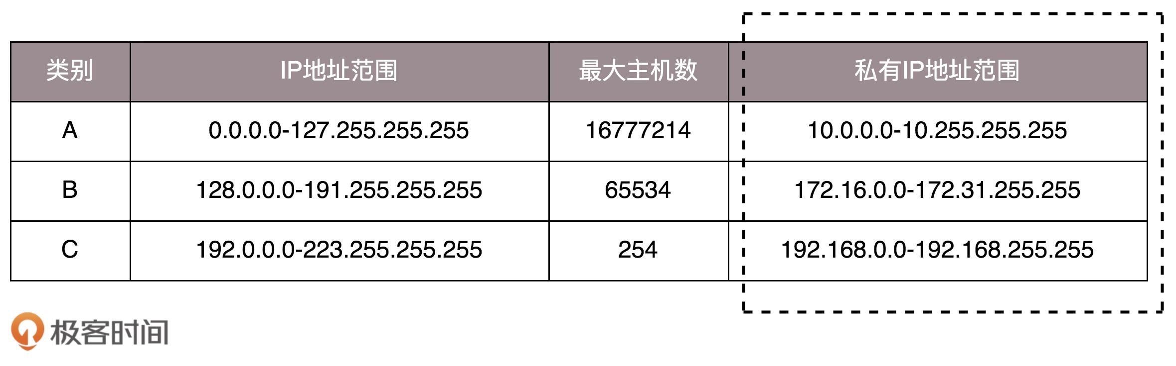 我们继续看上面的表格。表格最右列是私有IP地址段。平时我们看到的数据中心里,办公室、家里或学校的IP地址,一般都是私有IP地址段。因为这些地址允许组织内部的IT人员自己管理、自己分配,而且可以重复。因此,你学校的某个私有IP地址段和我学校的可以是一样的。