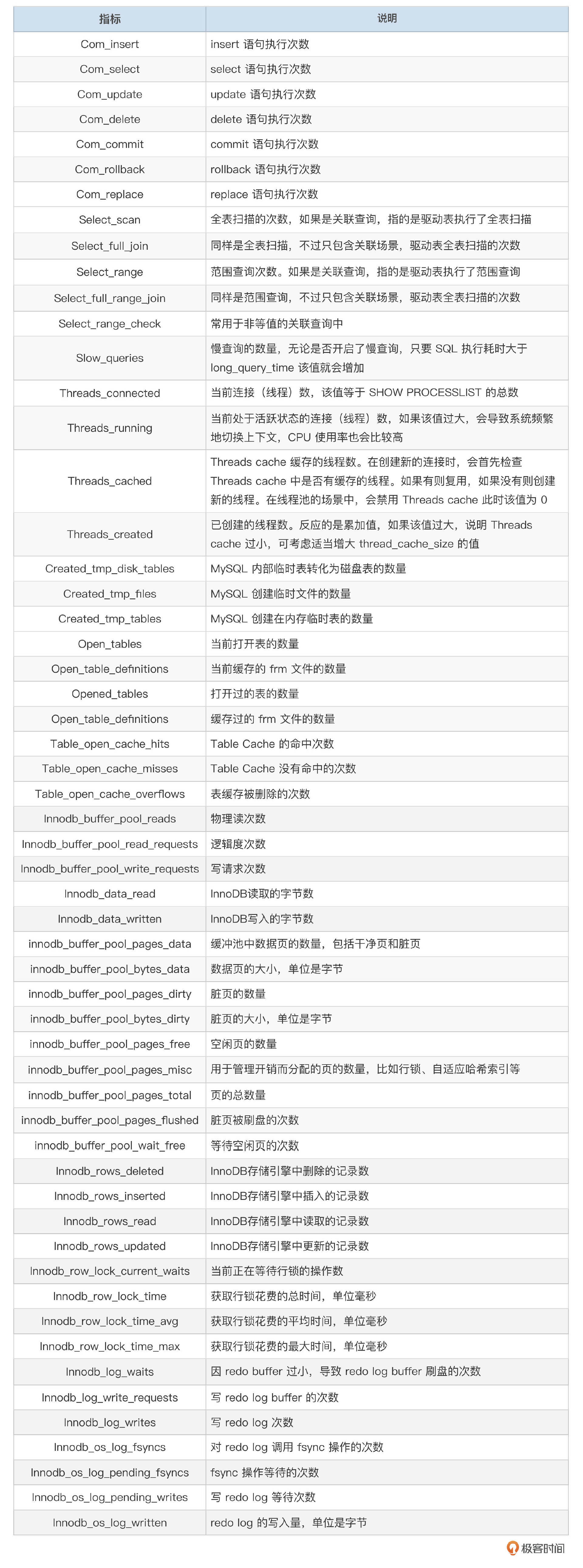 MySQL的内部运行信息,可以通过状态变量、一些系统命令和系统表查看。可以用show global status命令采集状态变量。有的状态变量是累加值,有的状态变量是当前值,采集或使用时需要注意。如果用时序数据库来存储指标数据,一般都会提供一些函数(如rate)来计算指标的差值。如果用传统的数据库存储指标数据,一般会在采集的时候就计算好指标的差值。