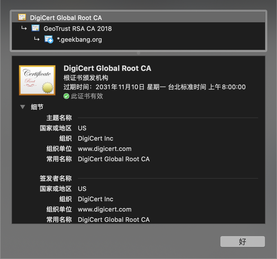 因此浏览器验证极客时间的证书时,会先验证*.geekbang.org的证书,如果合法,再验证中间CA的证书,如果中间CA也是合法的,那么浏览器会继续验证这个中间CA的根证书。