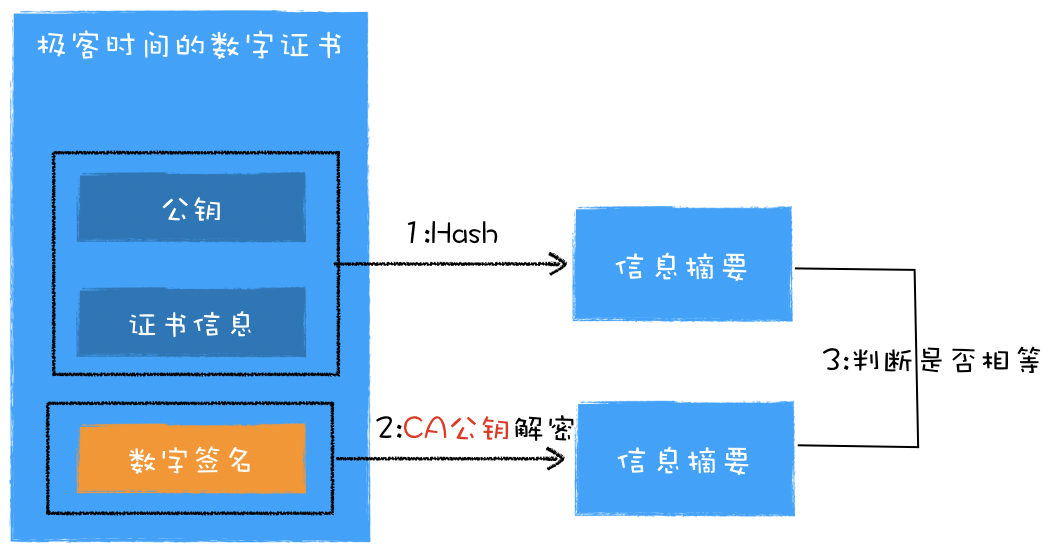 最后,还要**验证极客时间的数字证书是否是CA机构颁发的,**验证的流程非常简单: