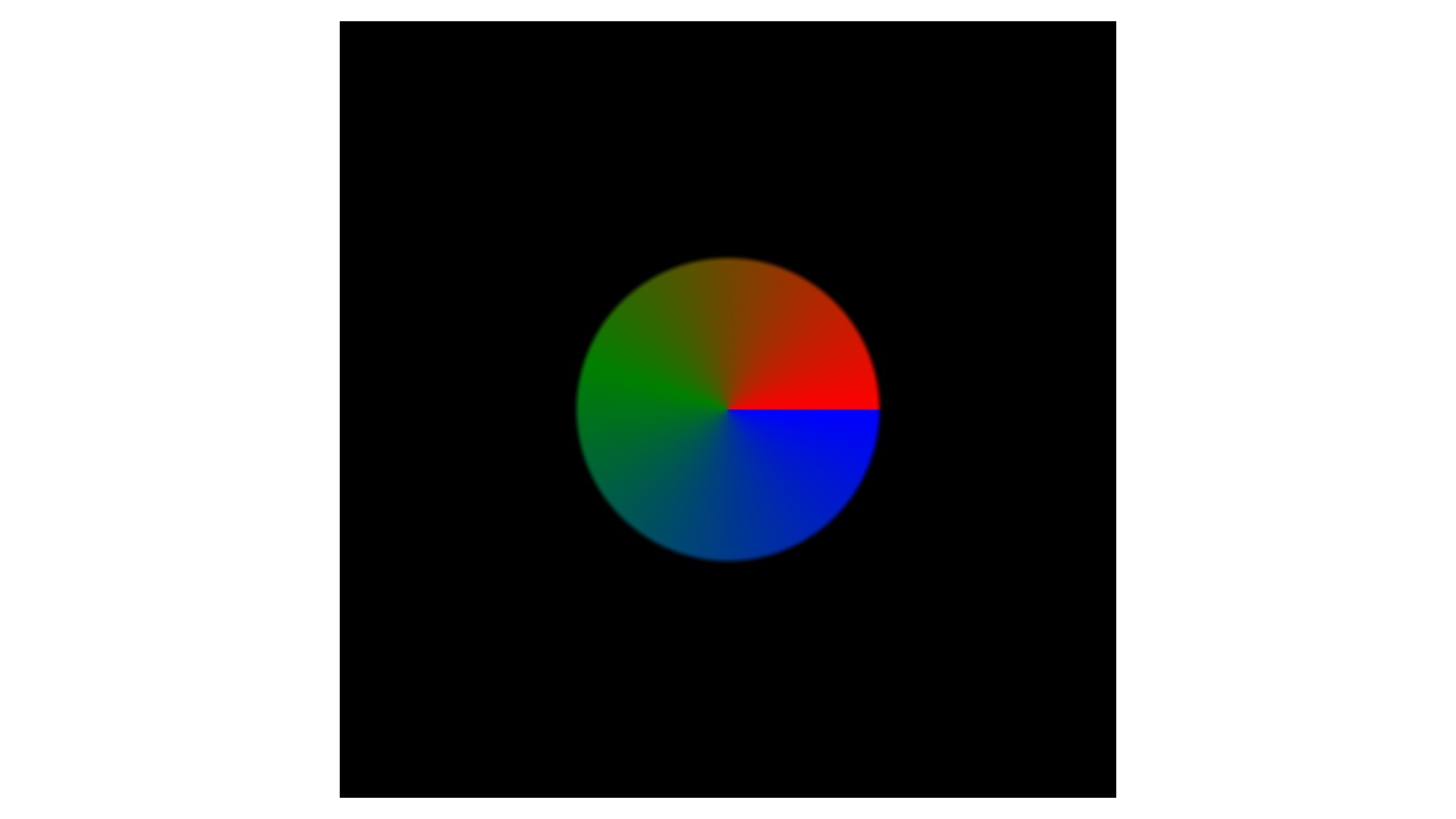 然后,我们根据角度换算出对应的比例对颜色进行线性插值。比如,比例在0%~45%之间,我们让颜色从红色过渡为绿色,那在45%到100%之间,我们让颜色从绿色过渡到蓝色。这样,我们最终就会得到如下效果: