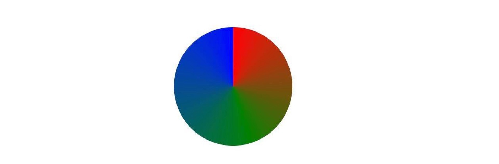 除了绘制有趣的图案之外,极坐标的另一个应用是角向渐变(Conic Gradients)。那角向渐变是什么呢?如果你对CSS比较熟悉,一定知道角向渐变就是以图形中心为轴,顺时针地实现渐变效果。而且新的 CSS Image Values and Replaced Content 标准 level4 已经添加了角向渐变,我们可以使用它来创建一个基于极坐标的颜色渐变,代码如下: