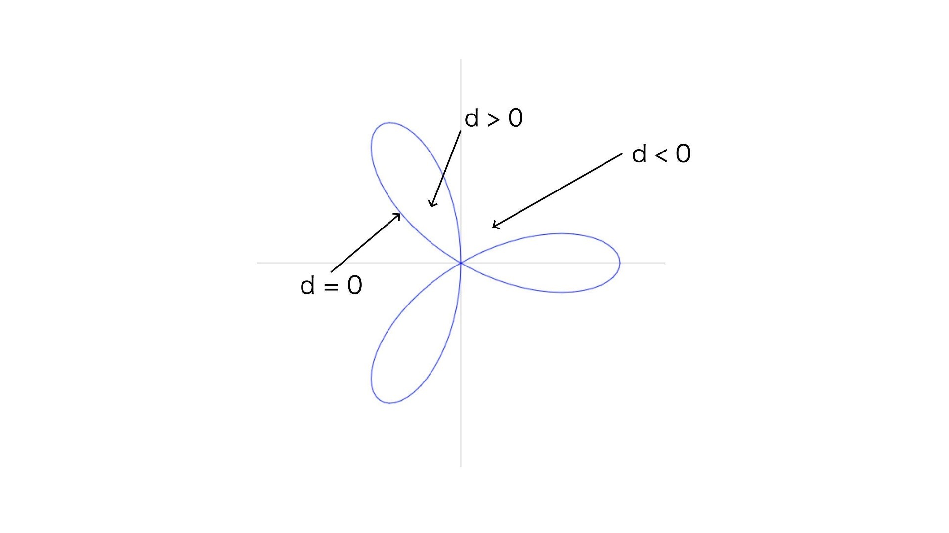这是因为玫瑰线的极坐标方程r = a * cos(k * θ),所以玫瑰线上的所有点都满足0 = a * cos(k * θ) - r 这个方程式。如果我们再把它写成距离场的形式:d = a * cos(k * θ) - r。这个时候就有三种情况:玫瑰线上点的 d 等于 0;玫瑰线围出的图形外的点的 d 小于0,玫瑰线围出的图形内的点的 d 大于 0。