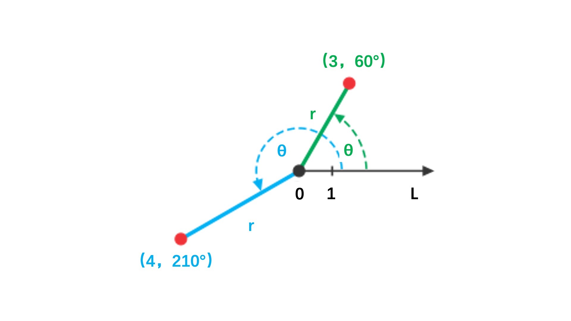 你对极坐标系应该也不陌生,它是一个二维坐标系。与二维直角坐标系使用x、y分量表示坐标不同,极坐标系使用相对极点的距离,以及与x轴正向的夹角来表示点的坐标,如(3,60°)。