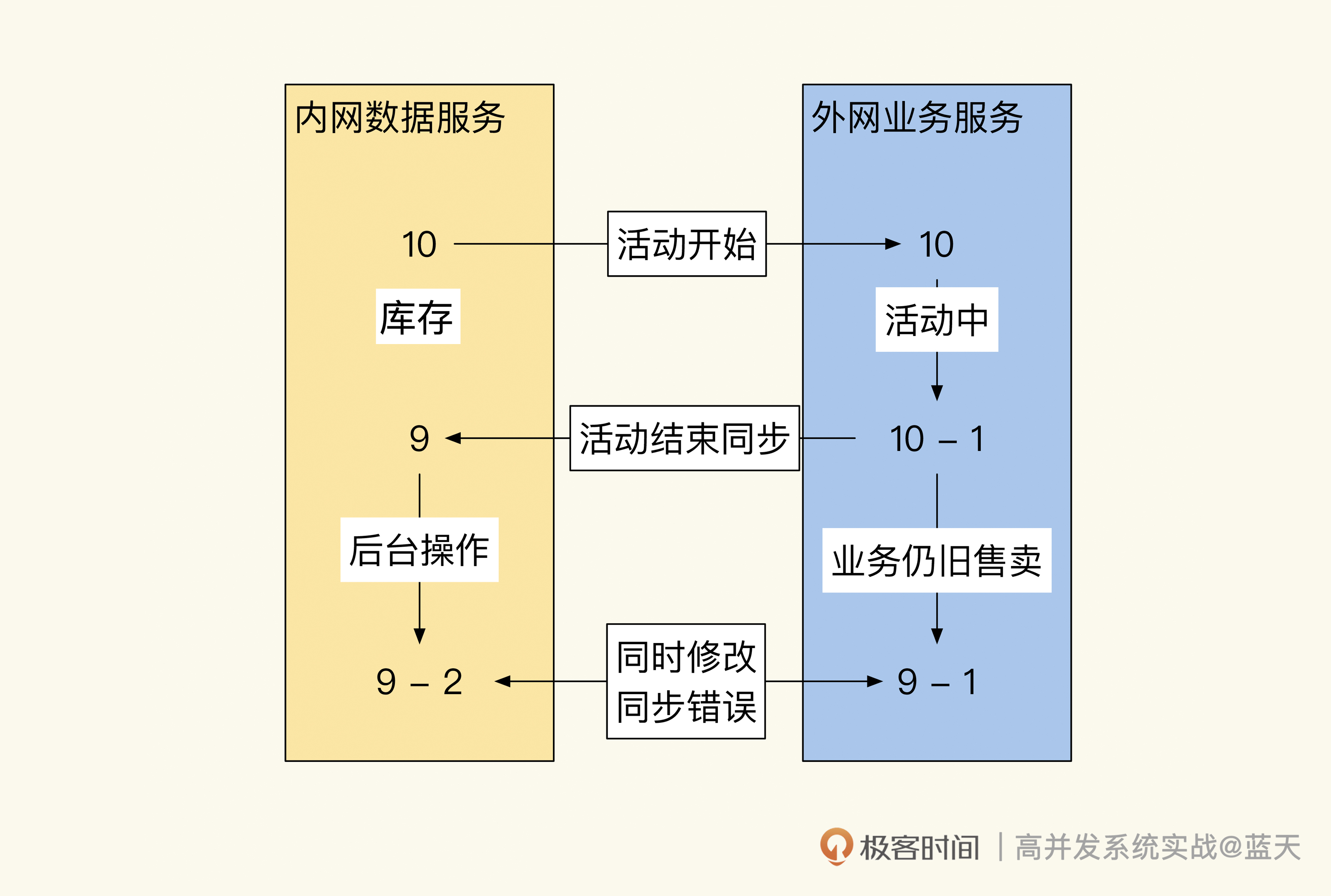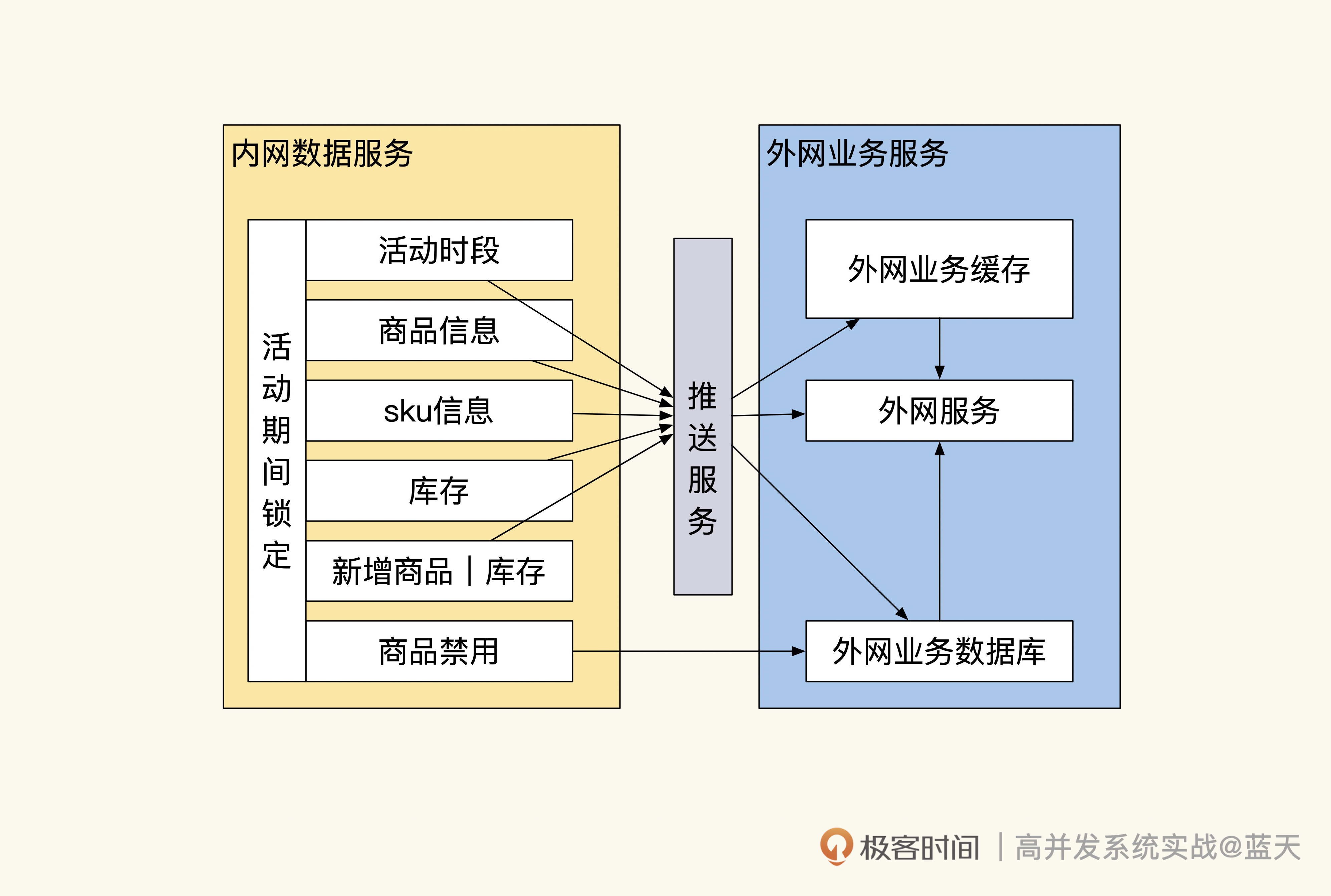 为了防止共享的数据被多个系统同时修改,我们会在活动期间把参与活动的数据和库存做推送,然后自动锁定,这样做可以防止其他业务和后台对数据做修改。若要禁售,则可以通过后台直接调用前台业务接口来操作;活动期间也可以添加新的商品到外网业务中,但只能增不能减。