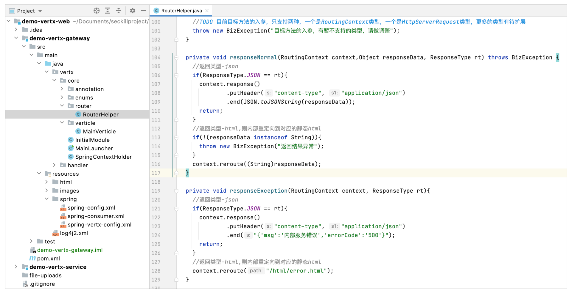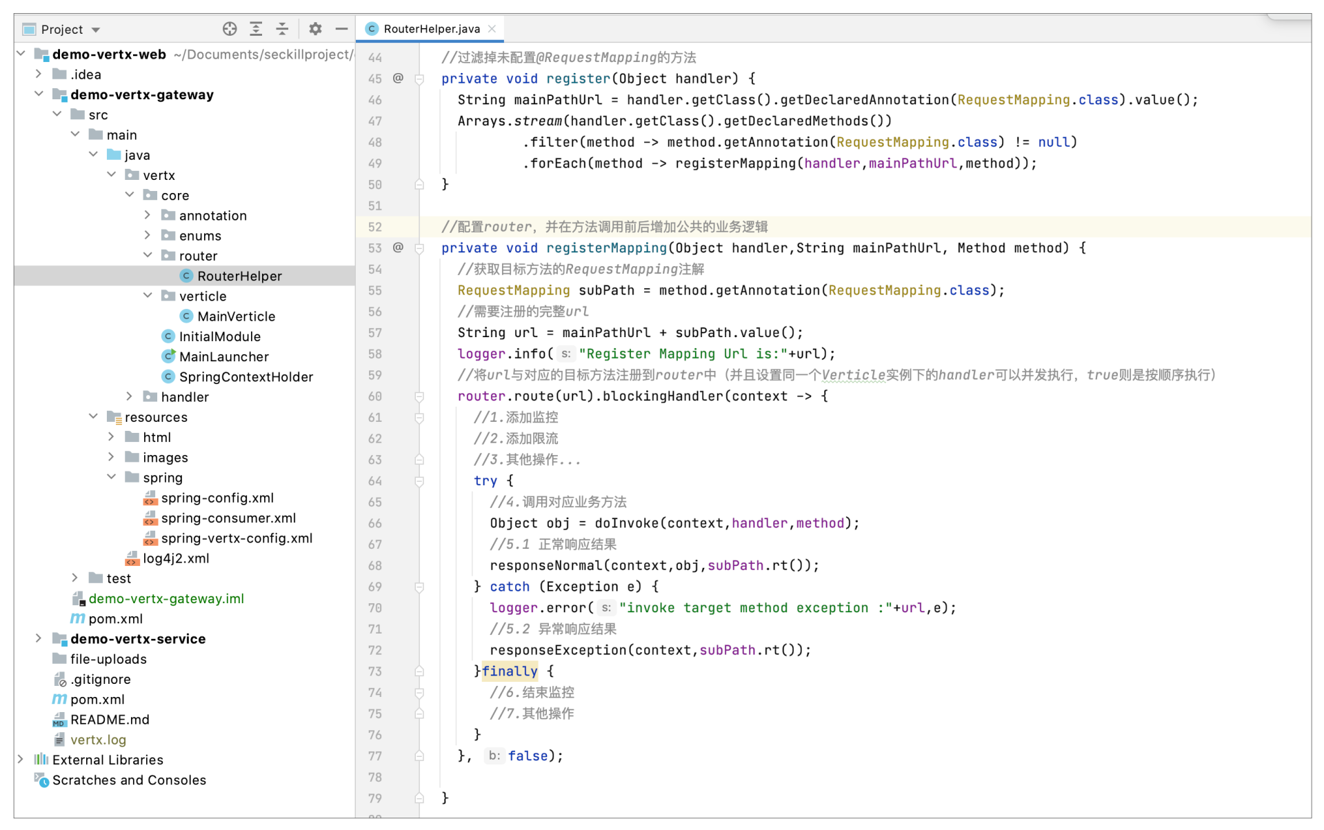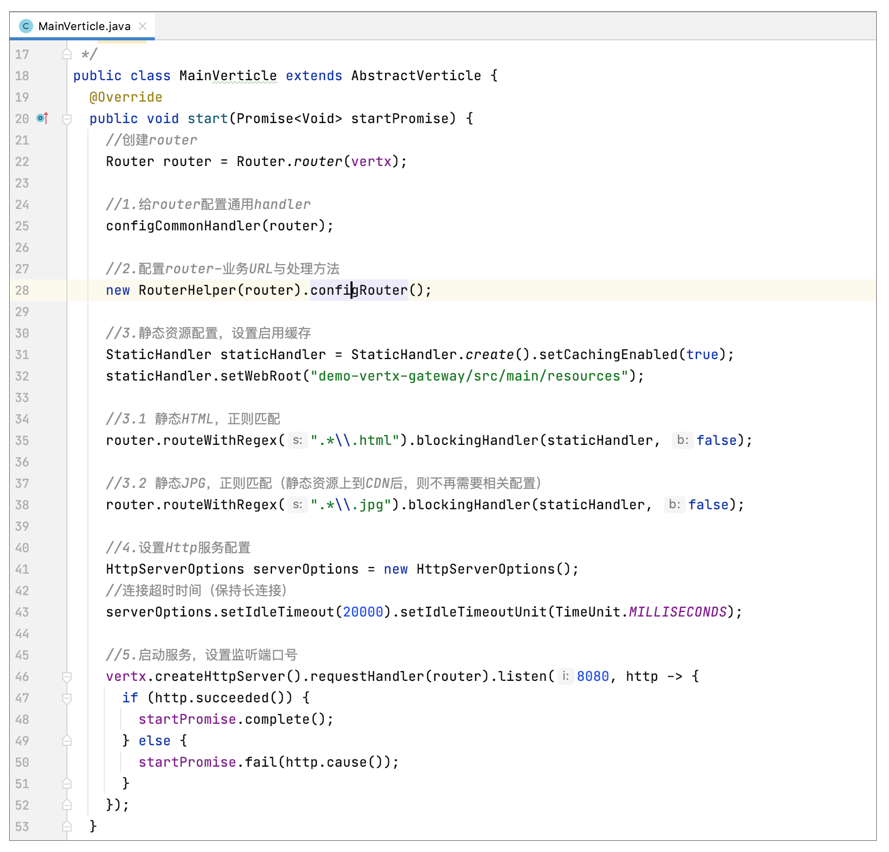 **第三步:**从上面可以看到,我们部署的实例是MainVerticle,在这里我们可以编排请求的处理流程,先看下代码,如下图所示: