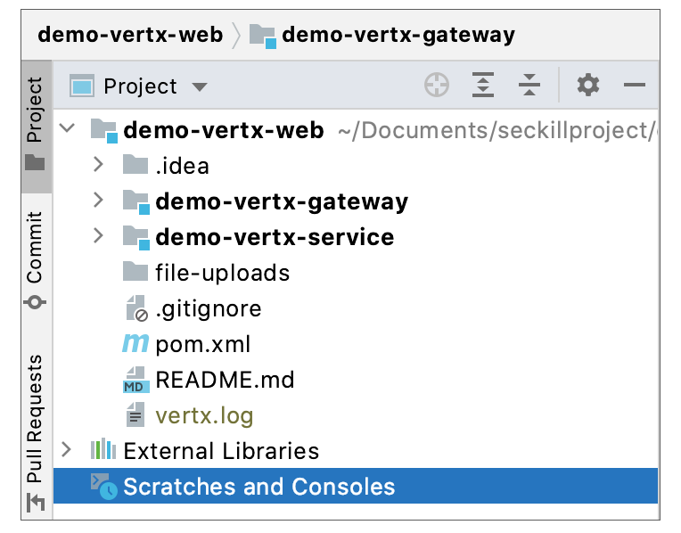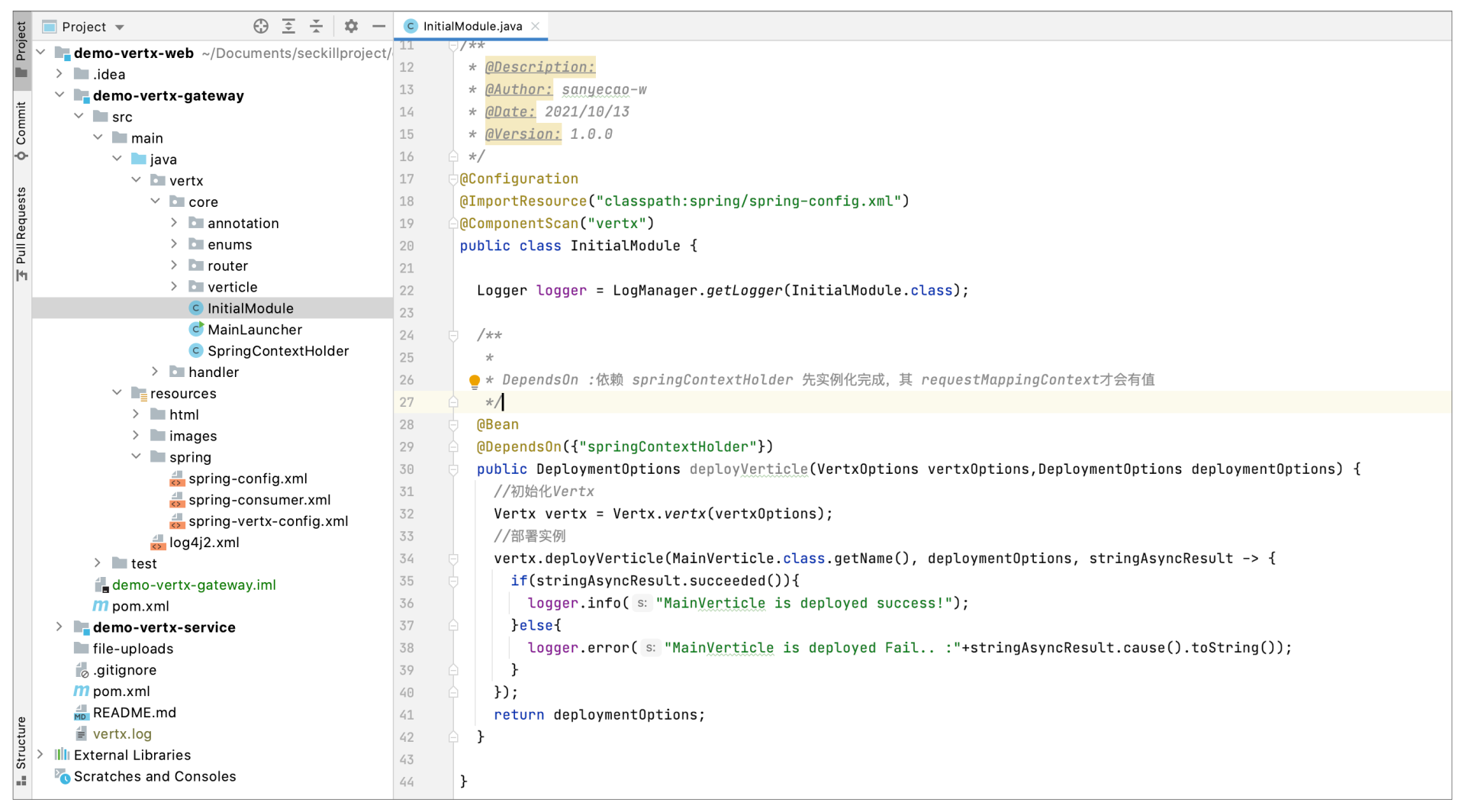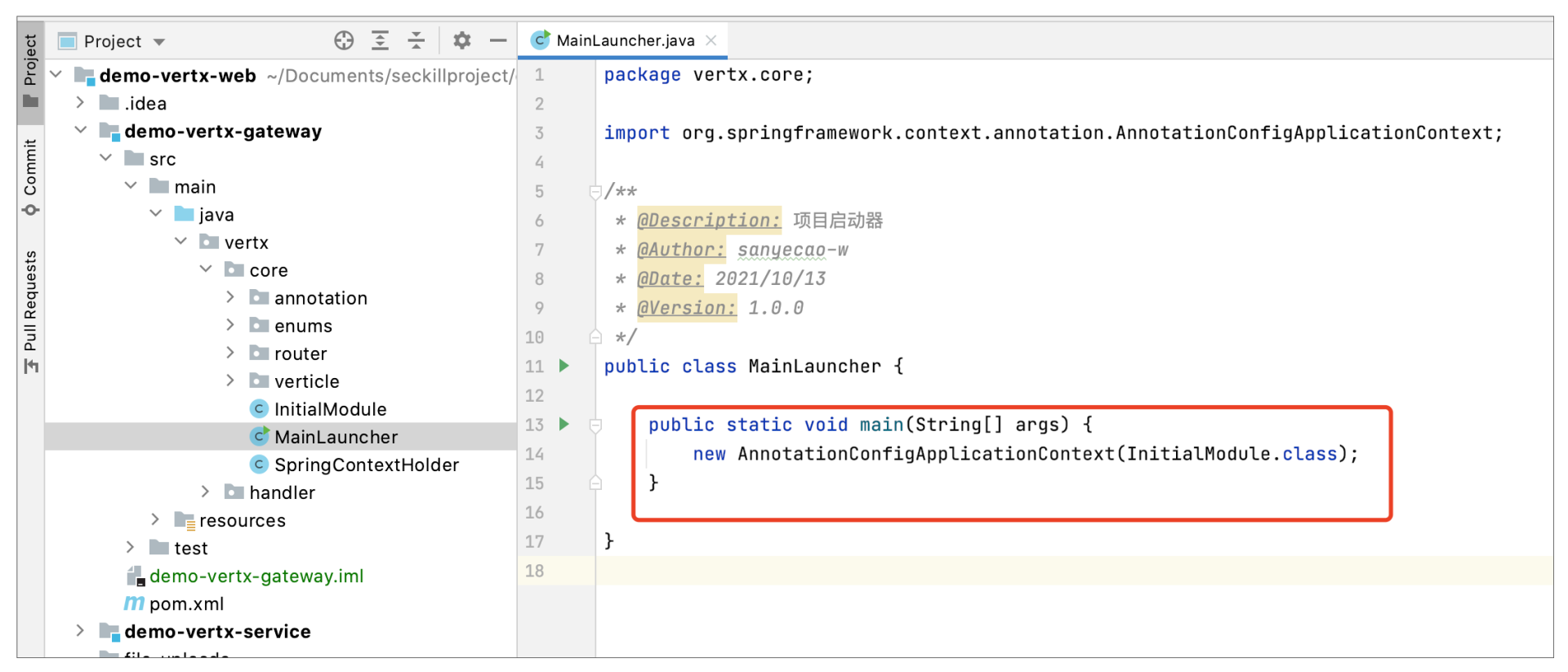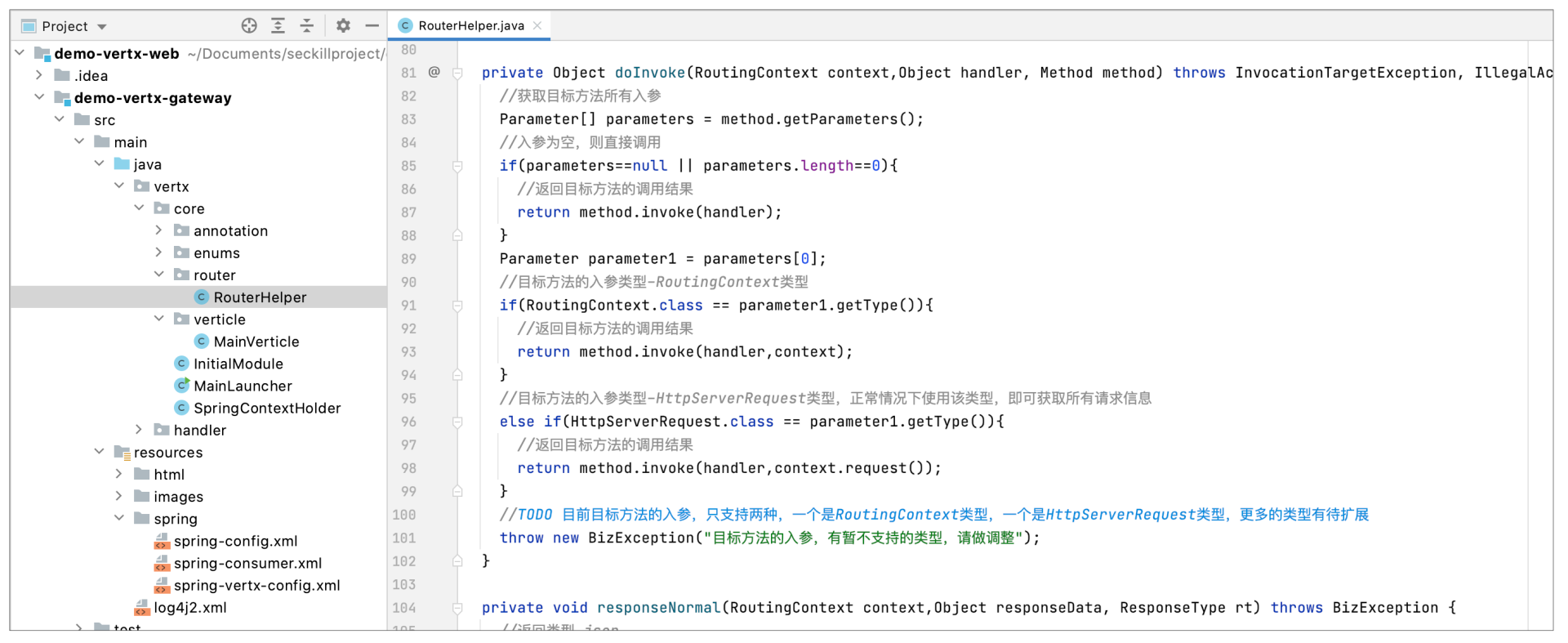其中demo-vertx-gateway模块用来做一些文件的配置,并且也是用来打包部署的,demo-vertx-service主要用来做业务聚合,这块的代码到时候可以直接将demo-web中的service模块代码拷过来即可。所以我们主要的改动点也都是在demo-vertx-gateway这一块。
