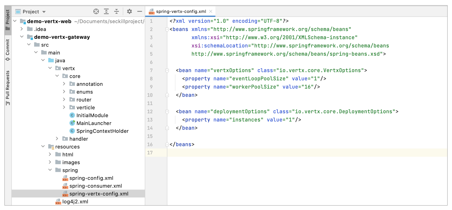 这里首先是导入Spring的配置文件spring-config,同时配置Spring的包扫描路径,其次是初始化Vertx,然后开始部署Verticle实例,这里Vertx的初始化配置和部署实例的配置如下: