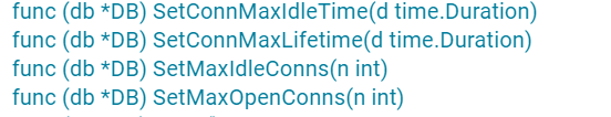 标准库sql.DB还提供了一个通用的数据库的连接池,通过MaxOpenConns和MaxIdleConns控制最大的连接数和最大的idle的连接数。默认的MaxIdleConns是2,这个数对于数据库相关的应用来说太小了,我们一般都会调整它。
