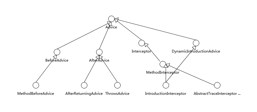 其中,BeforeAdvice和AfterAdvice包括它们的子接口是最简单的实现。而Interceptor则是所谓的拦截器,用于拦截住方法(也包括构造器)调用事件,进而采取相应动作,所以Interceptor是覆盖住整个方法调用过程的Advice。通常将拦截器类型的Advice叫作Around,在代码中可以使用“@Around”来标记,或者在配置中使用“<aop:around>”。