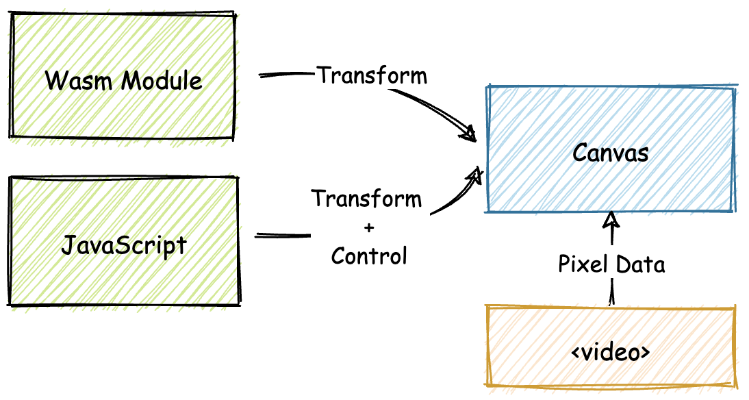 然后这些数据将会根据用户所选择的设置,分别传递给 Wasm 模块或 JavaScript 进行相应的滤镜处理。这里 JavaScript 还同时兼具控制整个应用 UI 交互的作用,比如处理“点击事件”,处理用户所选择的设置等等。