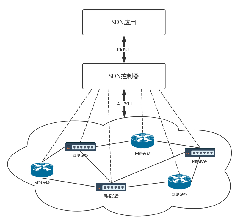 - 控制与转发分离:转发平面就是一个个虚拟或者物理的网络设备,就像小区里面的一条条路。控制平面就是统一的控制中心,就像小区物业的监控室。它们原来是一起的,物业管理员要从监控室出来,到路上去管理设备,现在是分离的,路就是走人的,控制都在监控室。