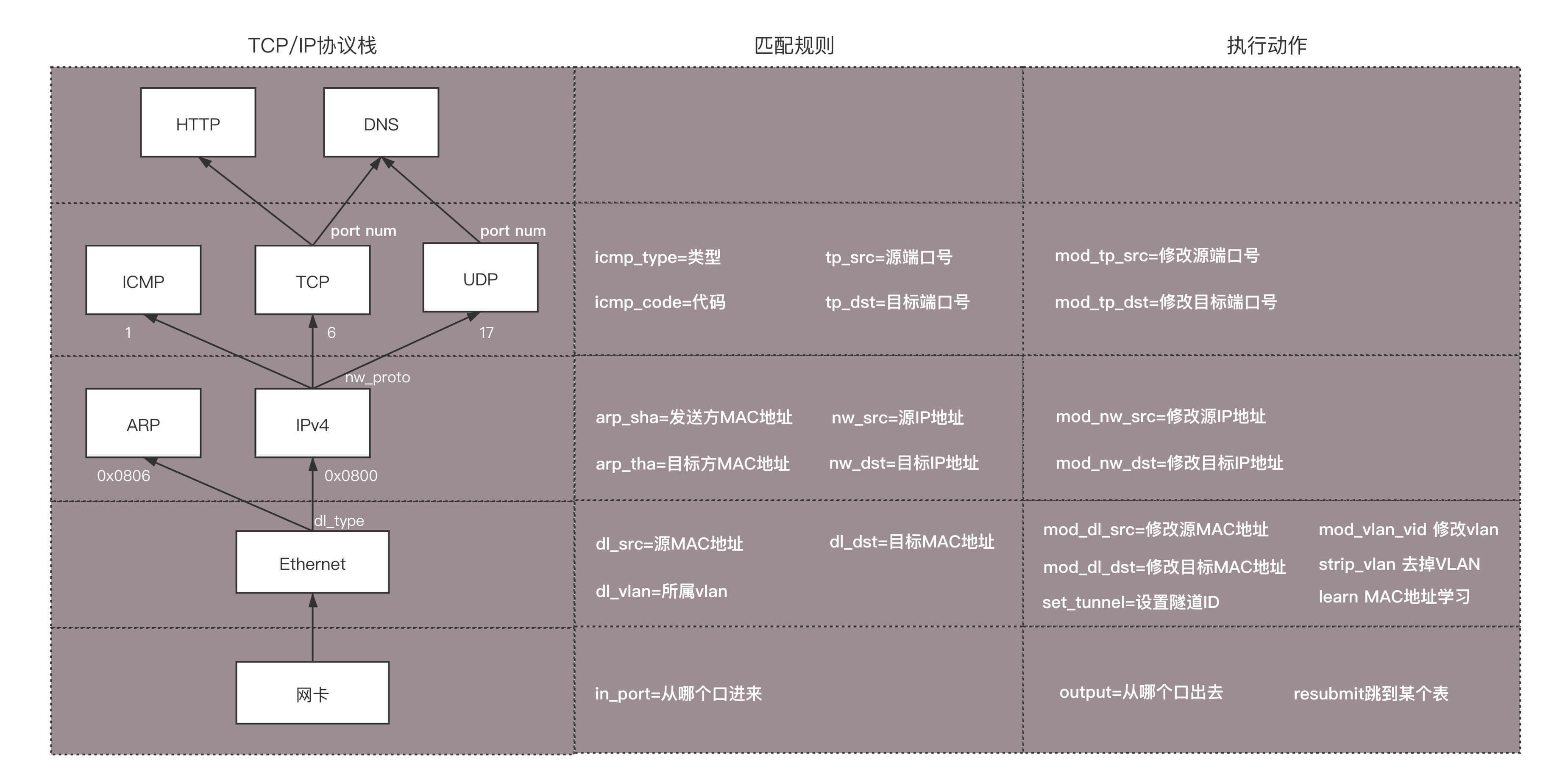 - 匹配规则包括:源MAC地址是多少?(dl_src),目标MAC是多少?(dl_dst),所属vlan是多少?(dl_vlan);