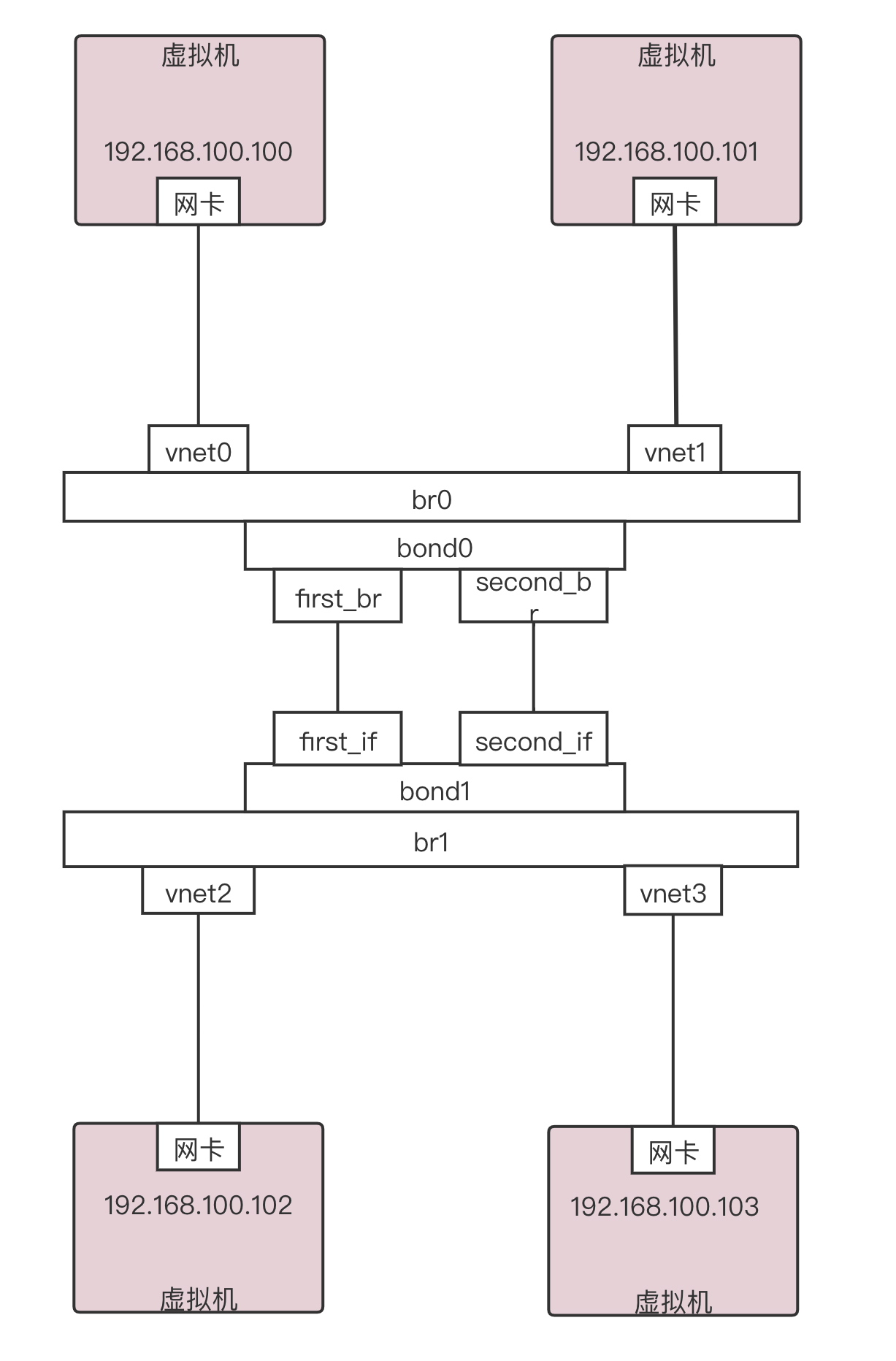 我们搭建一个测试环境。这个测试环境是两台虚拟机连接到br0上,另外两台虚拟机连接到br1上,br0和br1之间通过两条通路进行bond(绑定)。形成如下的拓扑图。
