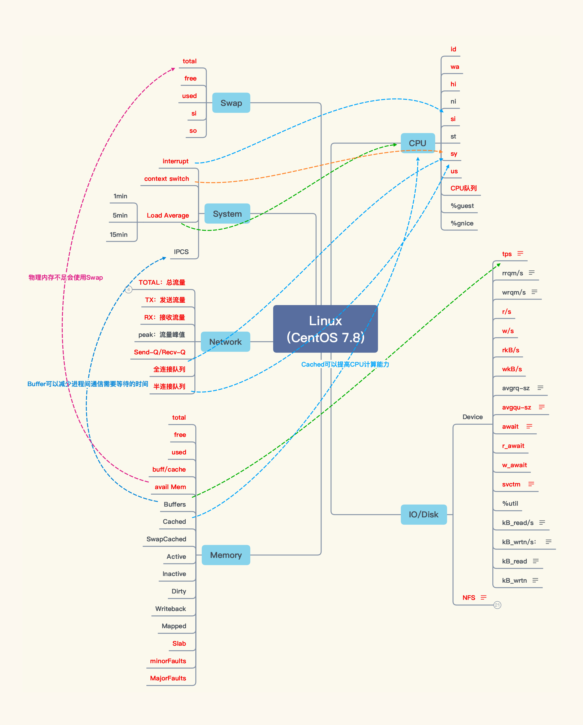 请你注意,这些计数器里,有一些会比较关键,我根据自己的经验,把重要的计数器都标红了。当然,如果你对操作系统有足够的理解,也可以从不同的角度,用不同的思路,列出自己的图。要知道,罗列计数器只是一个体力活,只要你愿意,就能列出来。