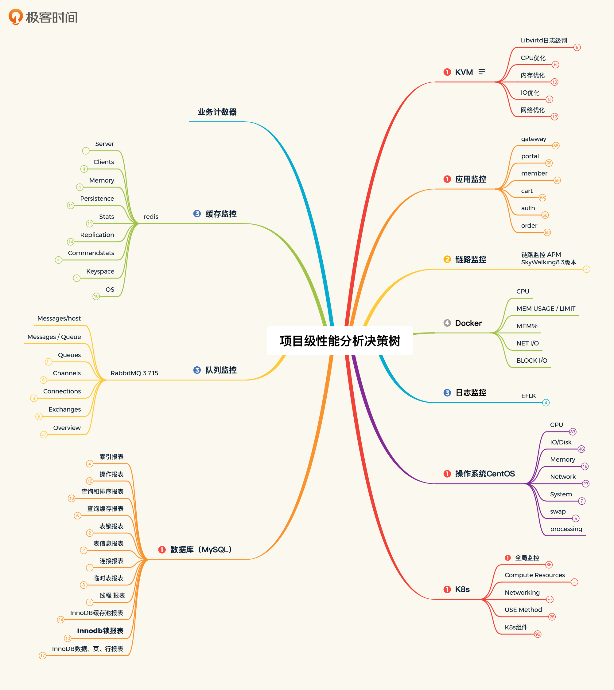 讲到这里,我就把性能分析决策树完整地给你描述完了,步骤也列清楚了。古人有云:授人以鱼不如授人以渔。所以,我希望你看到这些步骤之后,可以画出你自己项目中完整的性能分析决策树。