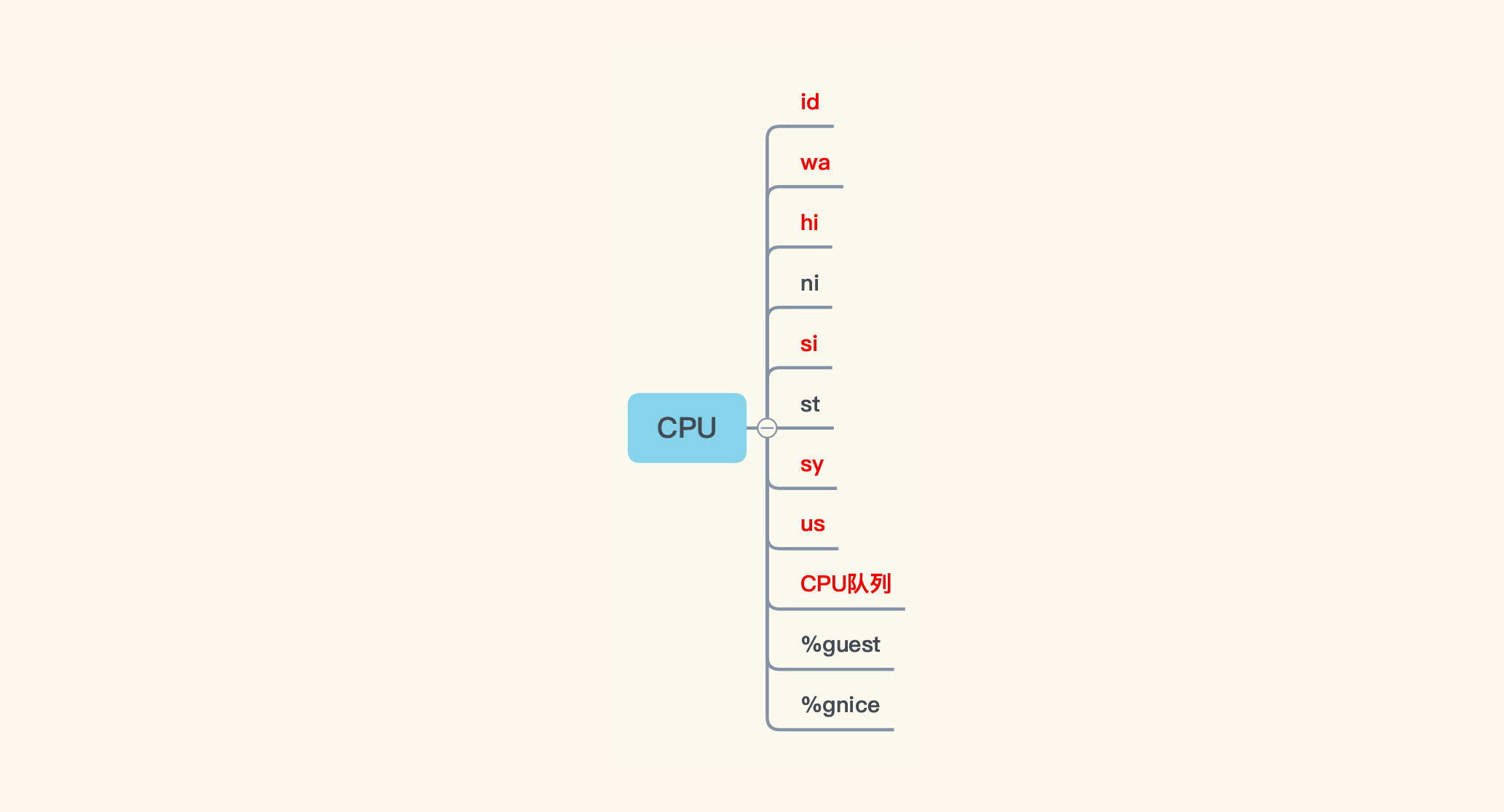 现在,我们来看其中一个重要的模块——CPU。我们可以通过top命令查看到CPU的几个重要的计数器: