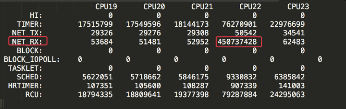 由于 /proc/softirqs文件中的各个计数器都是累加值,其他模块在各个CPU上的累加值比例都没有太大的差别,只有NET_RX模块在不同CPU上的计数值差别很大。所以,我们可以作出这样的判断:CPU 22的使用率高是因为NET_RX。