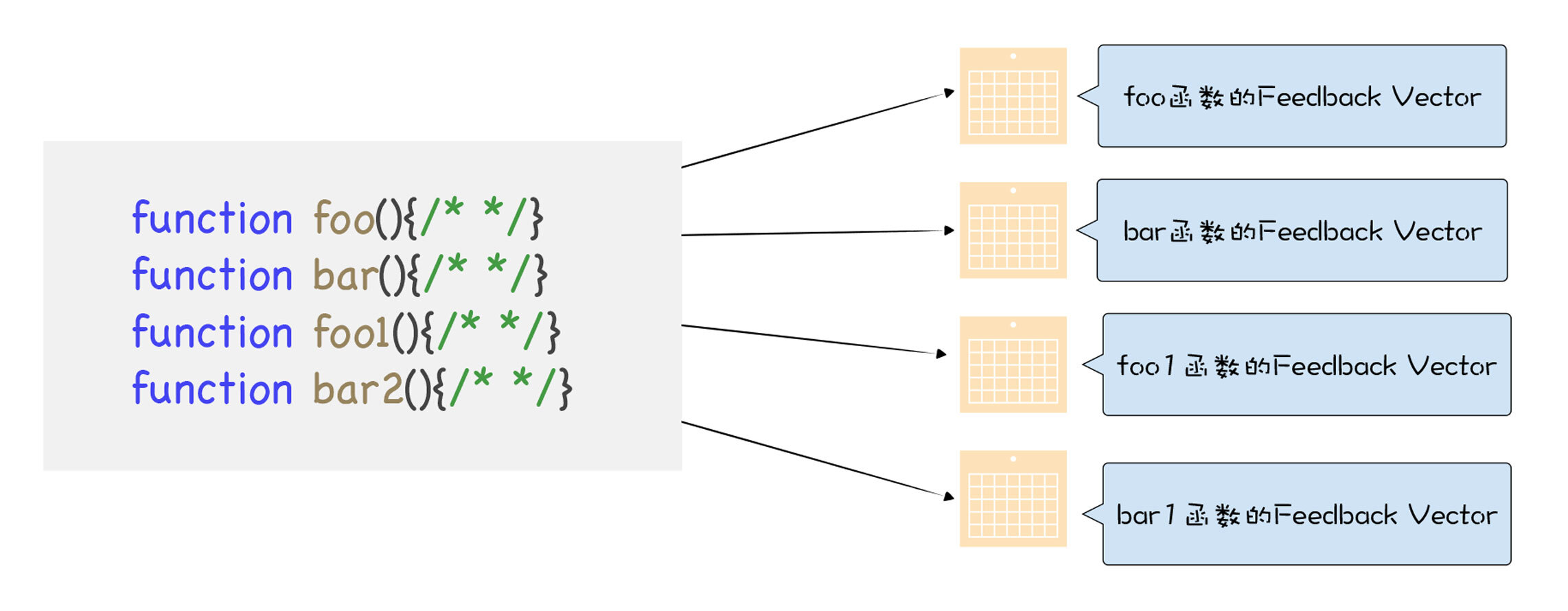 IC会为每个函数维护一个反馈向量(FeedBack Vector),反馈向量记录了函数在执行过程中的一些关键的中间数据。关于函数和反馈向量的关系你可以参看下图: