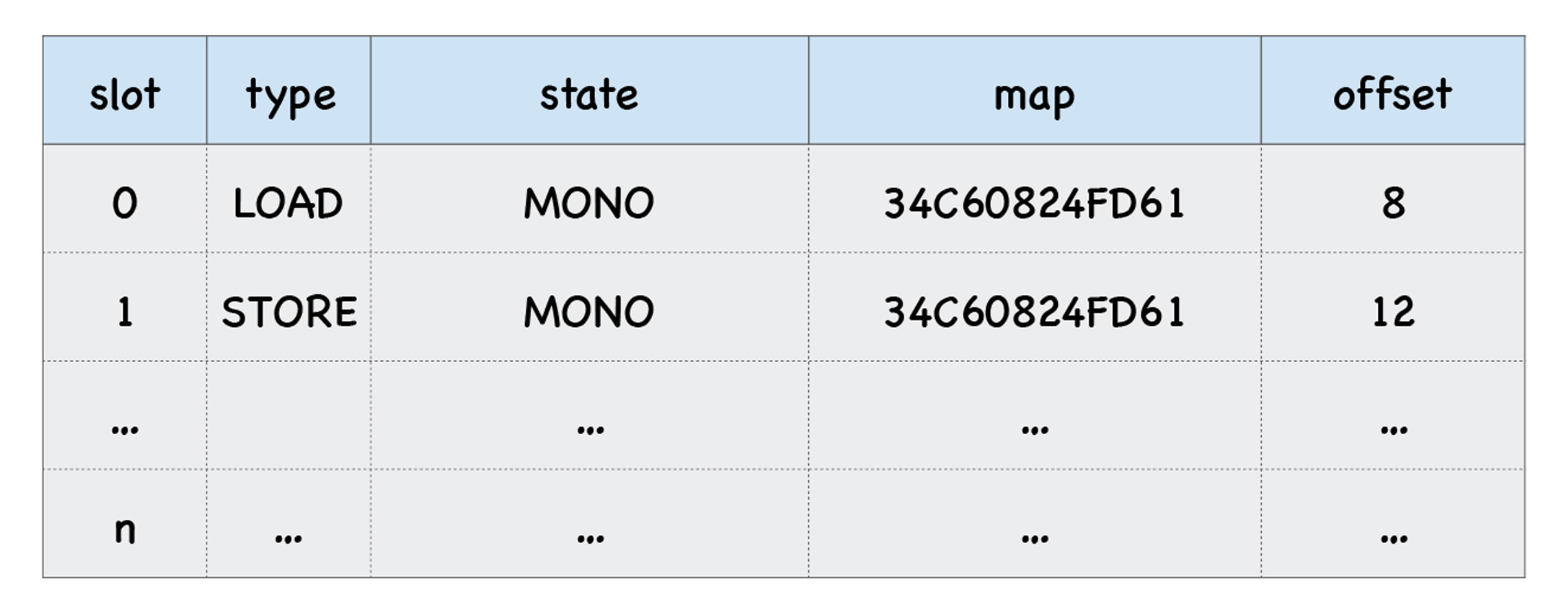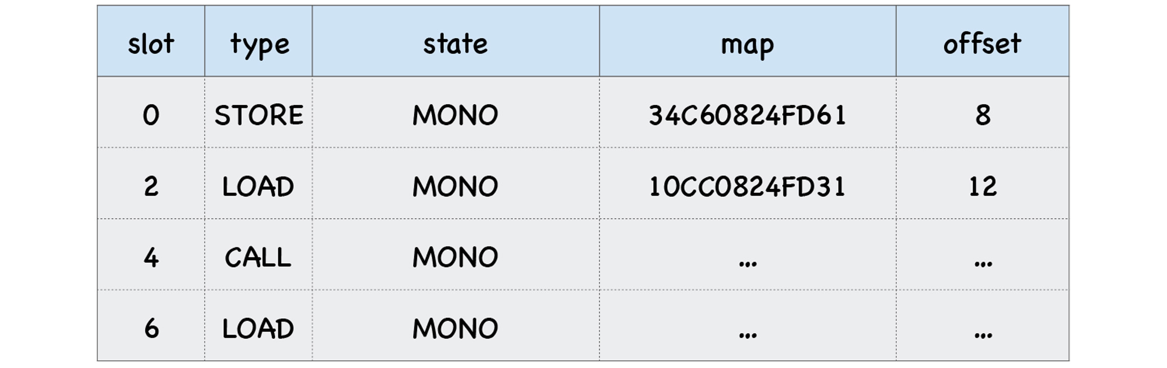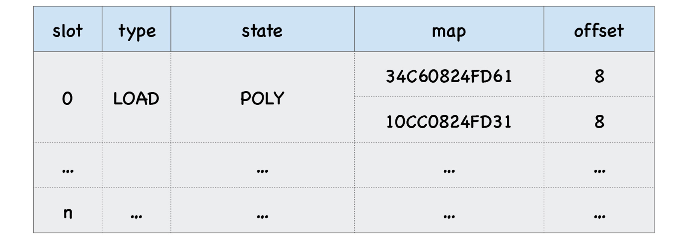 每个插槽中包括了插槽的索引(slot index)、插槽的类型(type)、插槽的状态(state)、隐藏类(map)的地址、还有属性的偏移量,比如上面这个函数中的两个调用点都使用了对象o,那么反馈向量两个插槽中的map属性也都是指向同一个隐藏类的,因此这两个插槽的map地址是一样的。