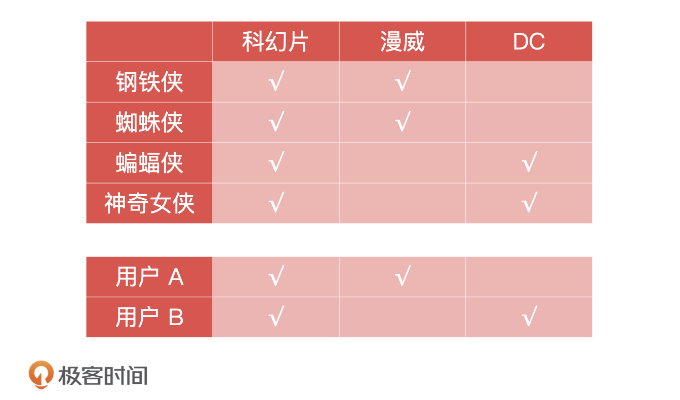 给电影打完标签之后,我们还要给每一个用户打上兴趣偏好标签,如用户 A 刚看完《钢铁侠》,就给用户 A 打上“科幻片”和“漫威”的标签,用户 B 看过《蝙蝠侠》,就给用户 B 打上“科幻片”和“DC”的标签,我们把这些信息都整理到了下面的表格中,你可以看看。