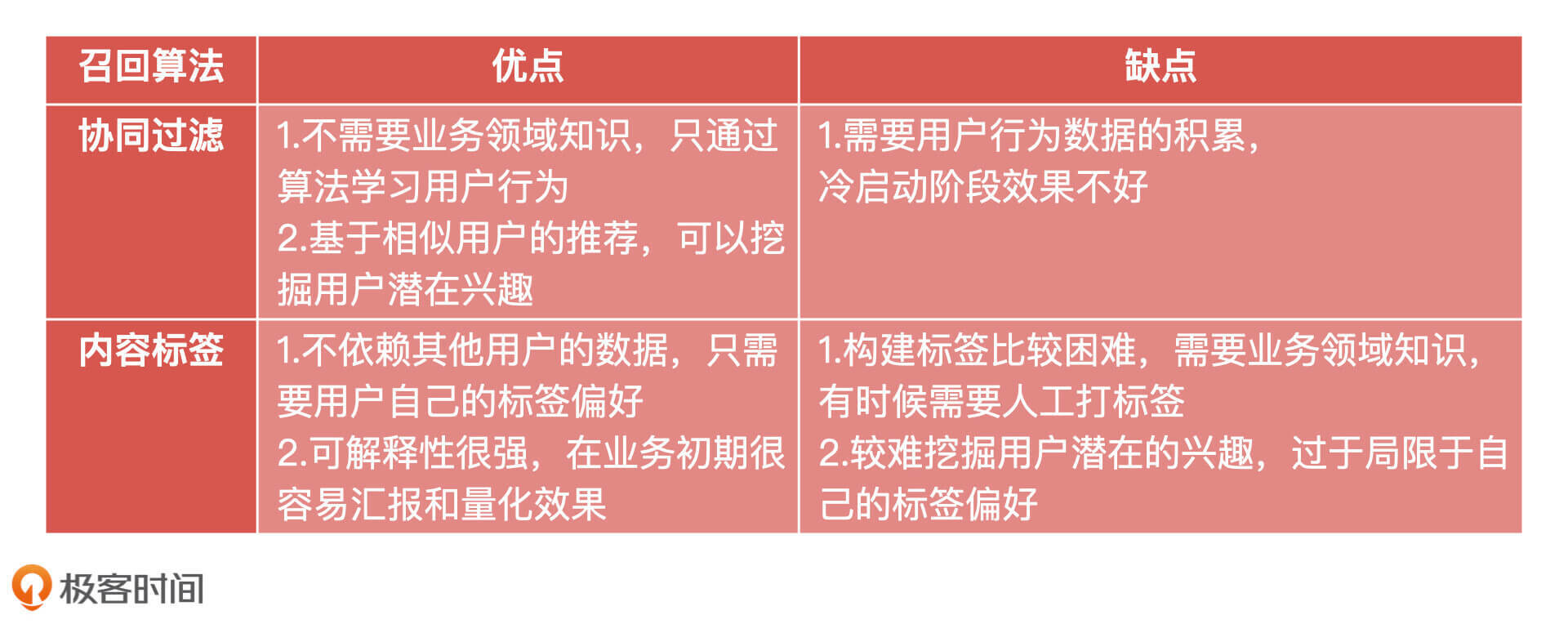 到这里,两种最常见的召回算法我们就讲完了。这两个召回算法作为推荐系统产品经理是必须要了解和掌握的。为了帮助你在实际工作中进行选择和评估,我把这两种算法的优缺点总结在了下面。