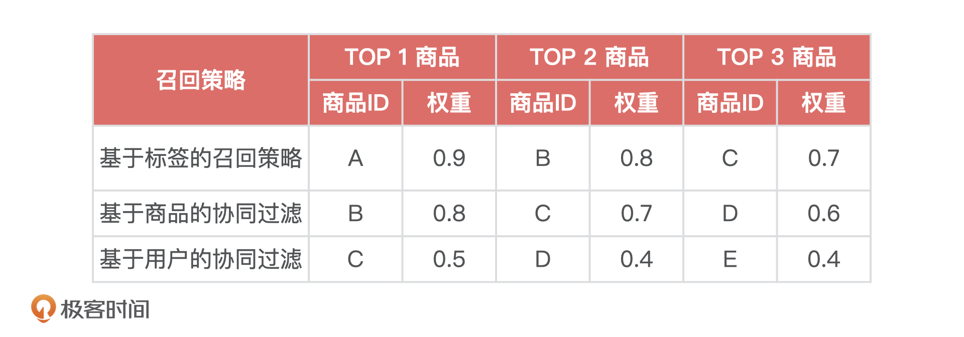 下面我再通过一个例子,来讲解一下排序阶段几种常见的排序策略。假如,我们使用了3种召回策略,分别得到了3个商品列表,以及每个商品所在列表中的评分。