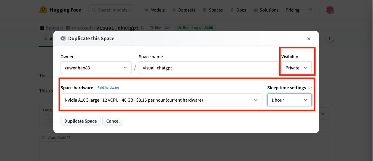 因为我们复制的是原先的Space,所以对应的硬件配置也是和微软免费提供的一样。通过一块46G显存的A10显卡,我们可以直接装载所有用到的模型。不过,使用A10显卡的Space是有成本的,一个小时就要花去你3.15美元。所以在复制Space的时候,有两个参数你需要注意。