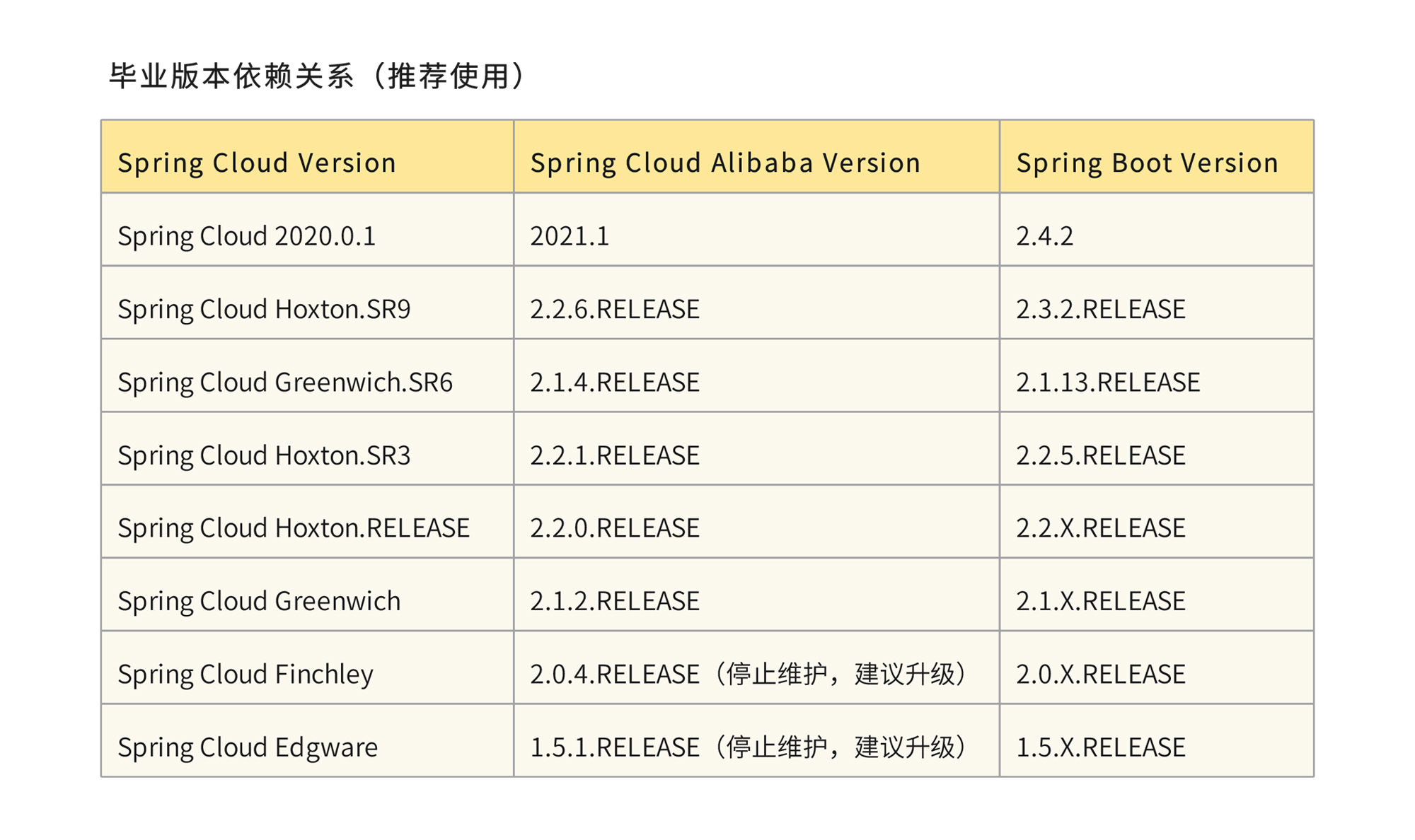 我推荐你使用上图中指定的版本组合,这里列出的组合都是经过兼容性测试的稳定版本,可以用在生产环境中。我这里选择Spring Cloud 2020.0.1、Spring Cloud Alibaba 2021.1和Spring Boot 2.4.2作为实战项目的依赖版本。